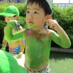 2025年8月27日 / 最終更新日時 : 2025年10月17日 kashiwabara 2歳児クラス「ボディペインティング」 夏ならではの遊び、「ボディペインティング」を楽しみました。手や顔、体に絵の具をつけて、ダイナミックに遊びました。