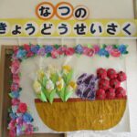 2025年8月27日 / 最終更新日時 : 2025年10月17日 kashiwabara 夏の共同製作 夏のお盆時期は合同保育で、みんなで夏野菜畑製作をしました。 0・1歳児のお友だちは足形のナス、2歳児のお友だちはお花紙のトウモロコシ、3歳児のお友だちはトマト、4・5歳児のお友だちはにじみ絵のアサガオを作りました。