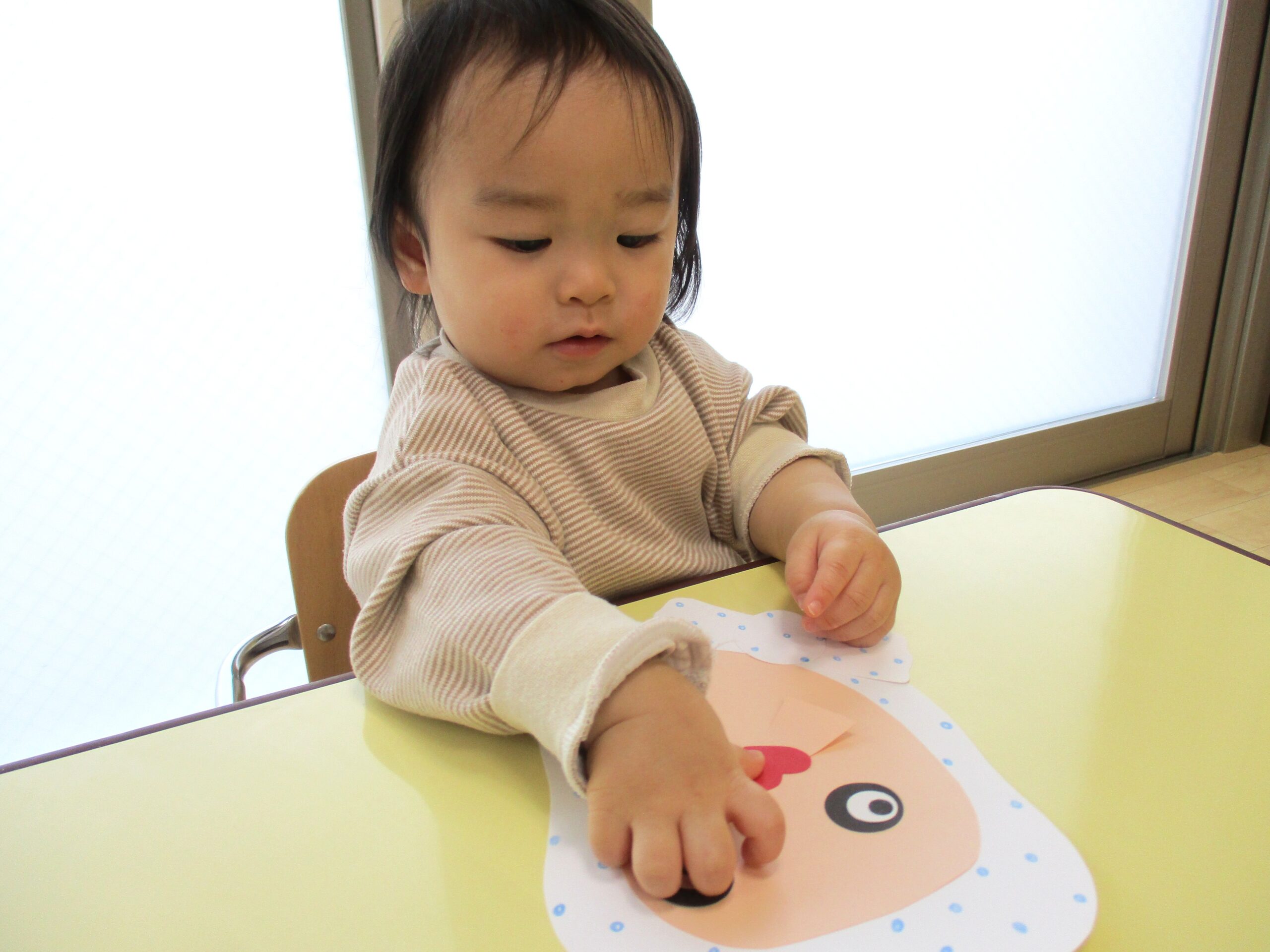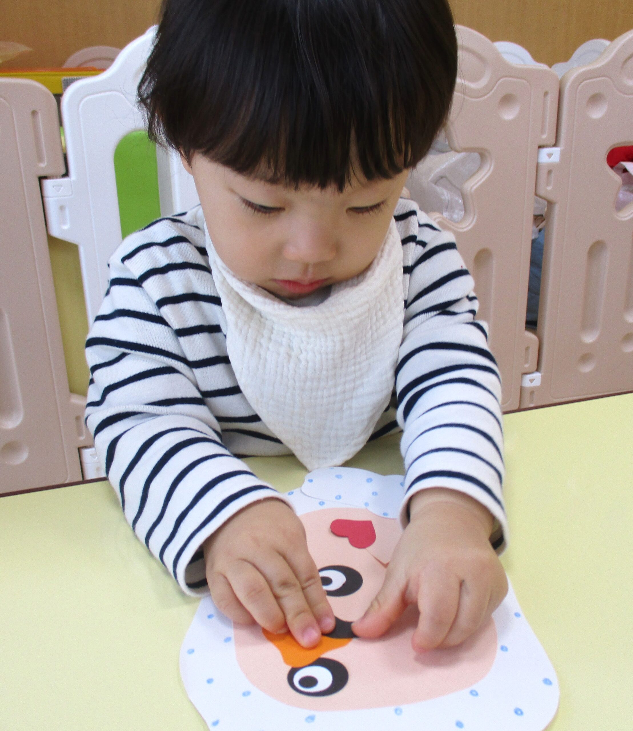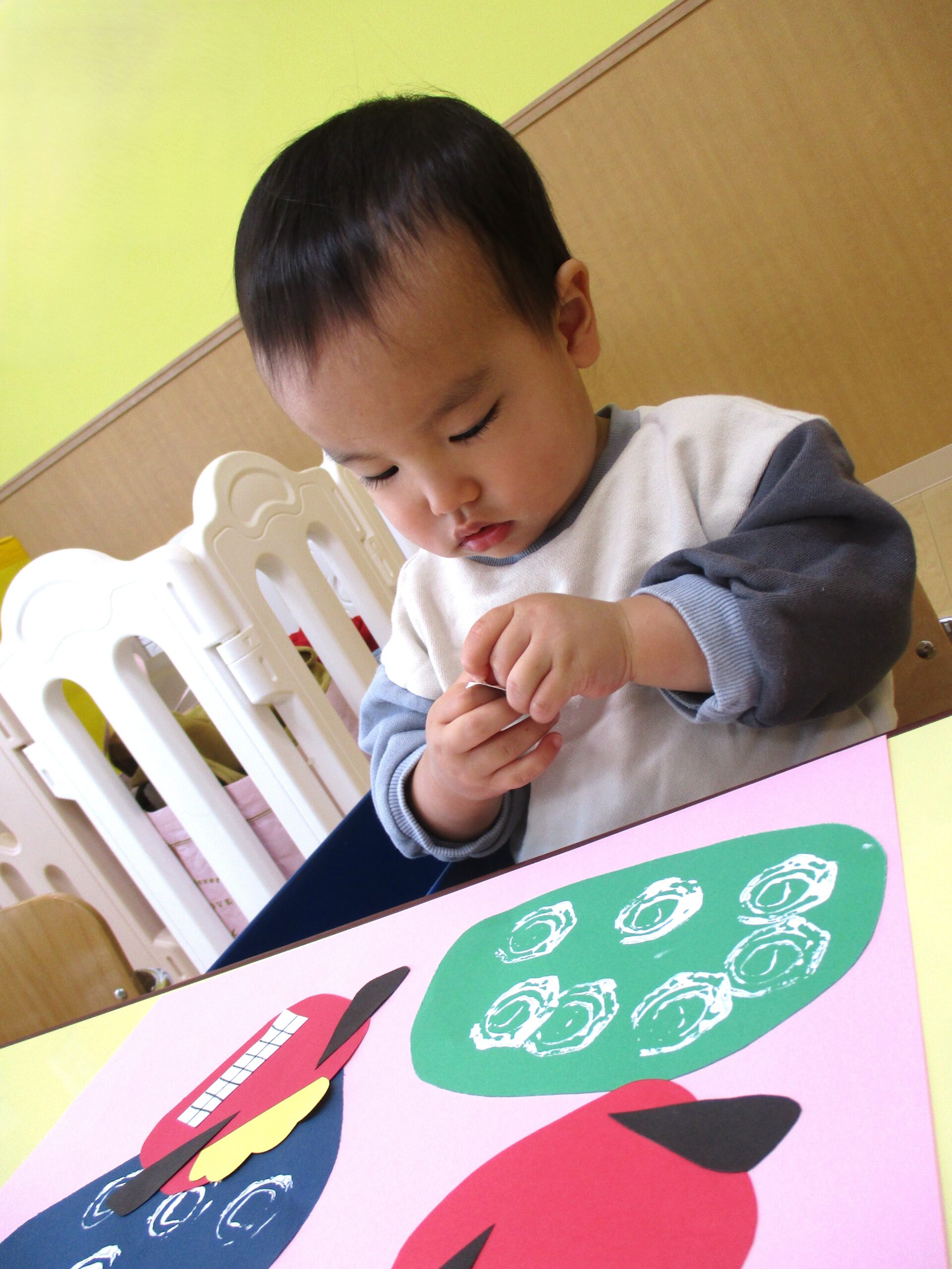 0歳児クラスは「福笑い」の製作 表情豊かな楽しい作品になりました。