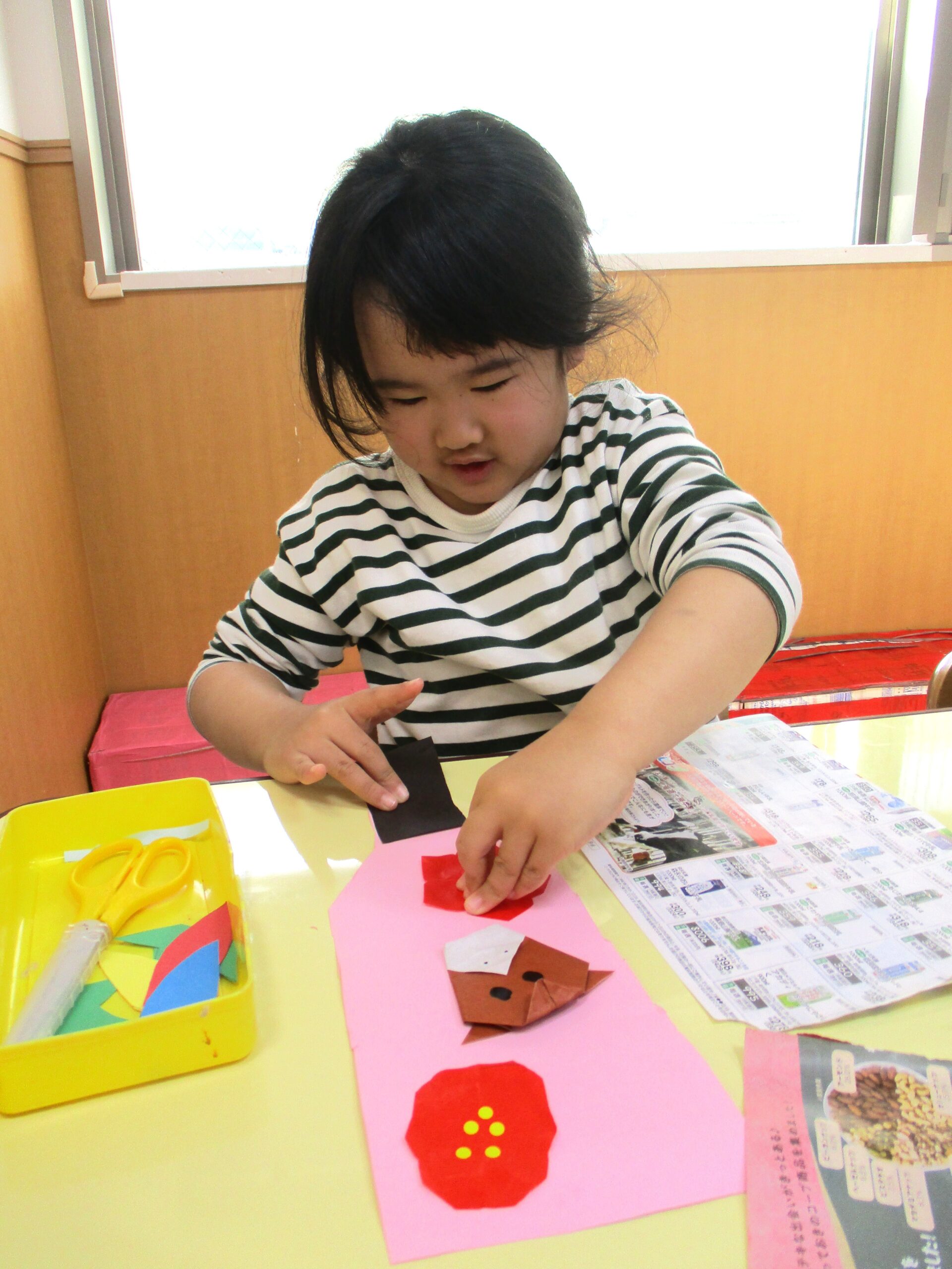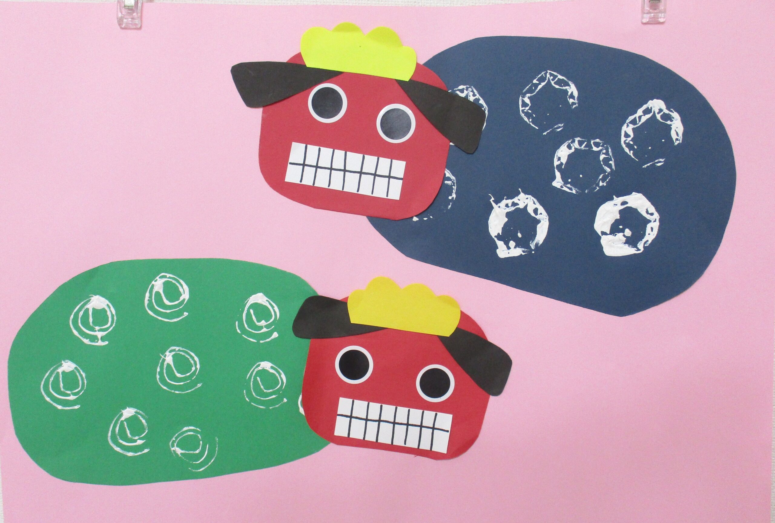 1歳児クラスは段ボールスタンプで獅子舞いを作りました。