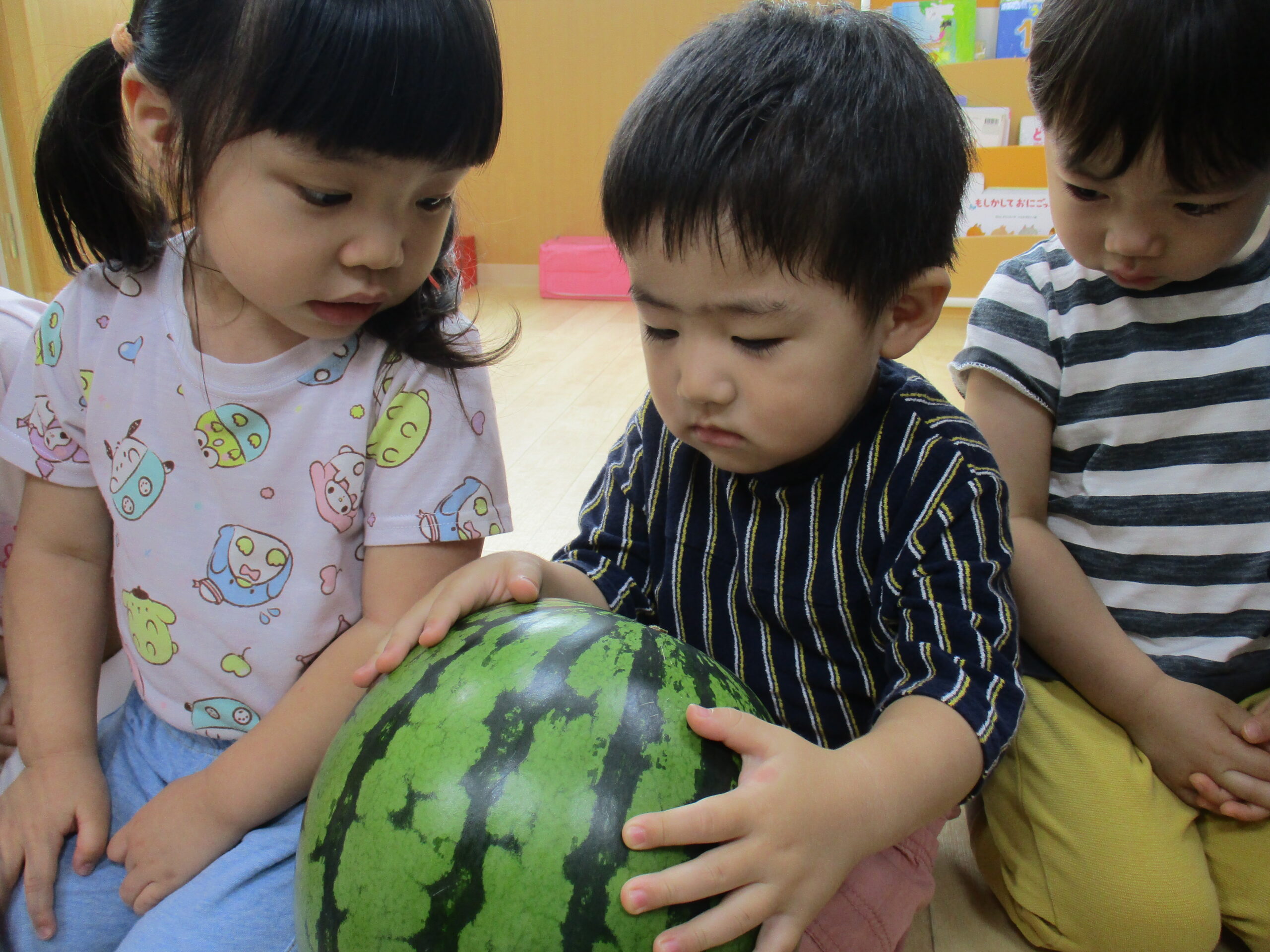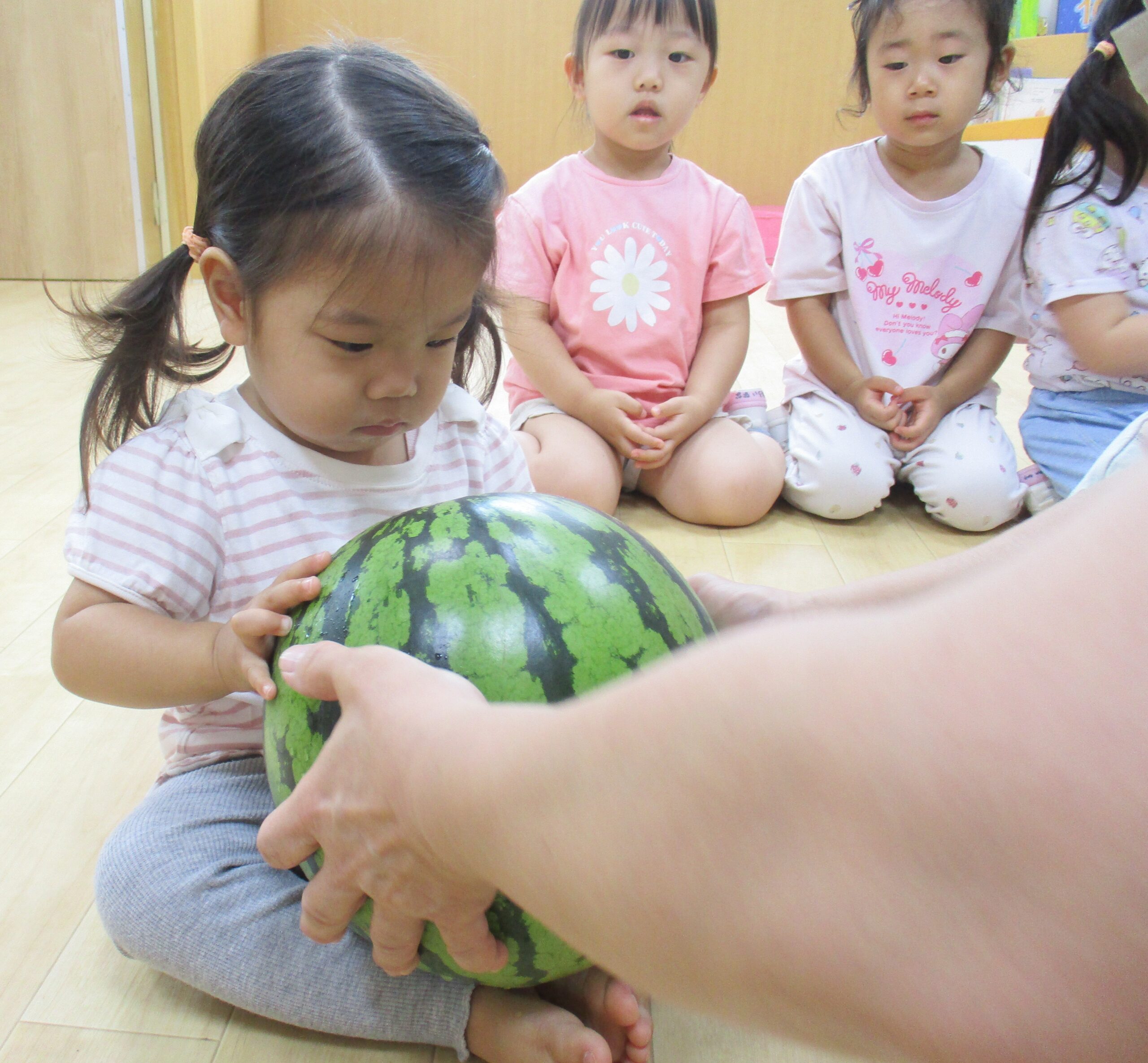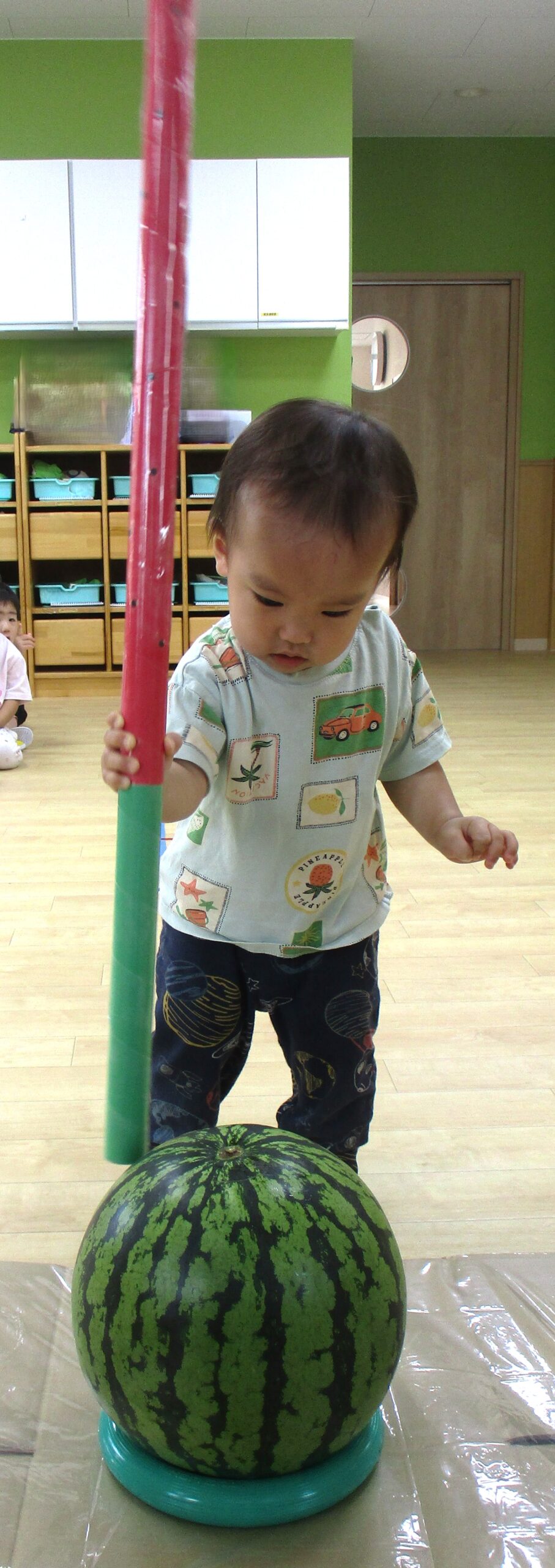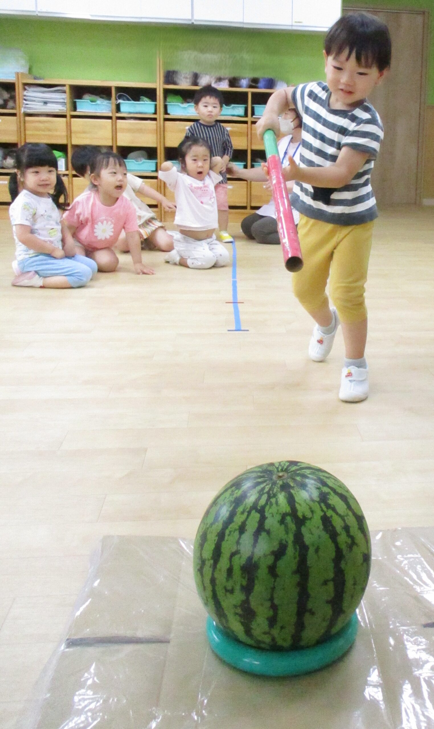 乳児クラスはお部屋でスイカ割りをしました。大きくて重いスイカにビックリしていたお友だちもいました。