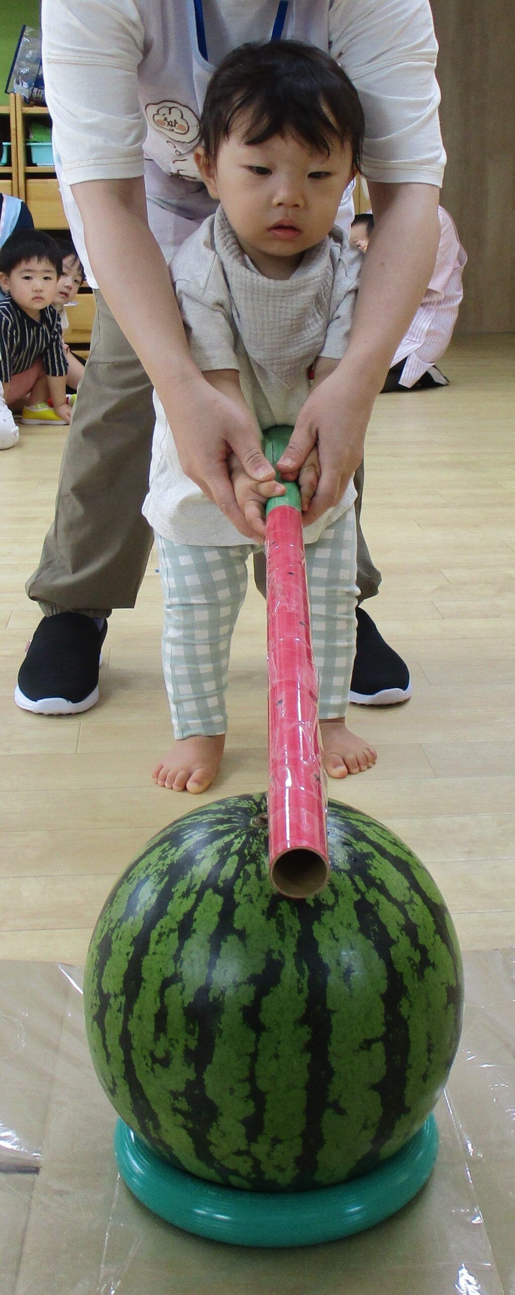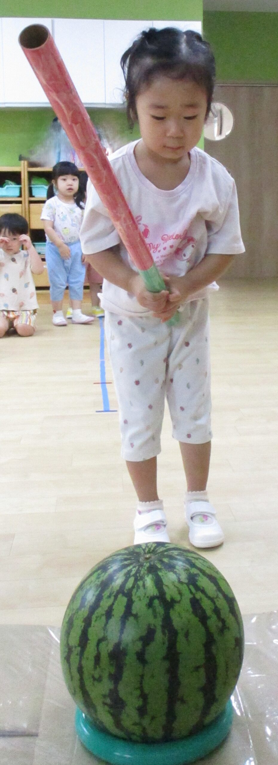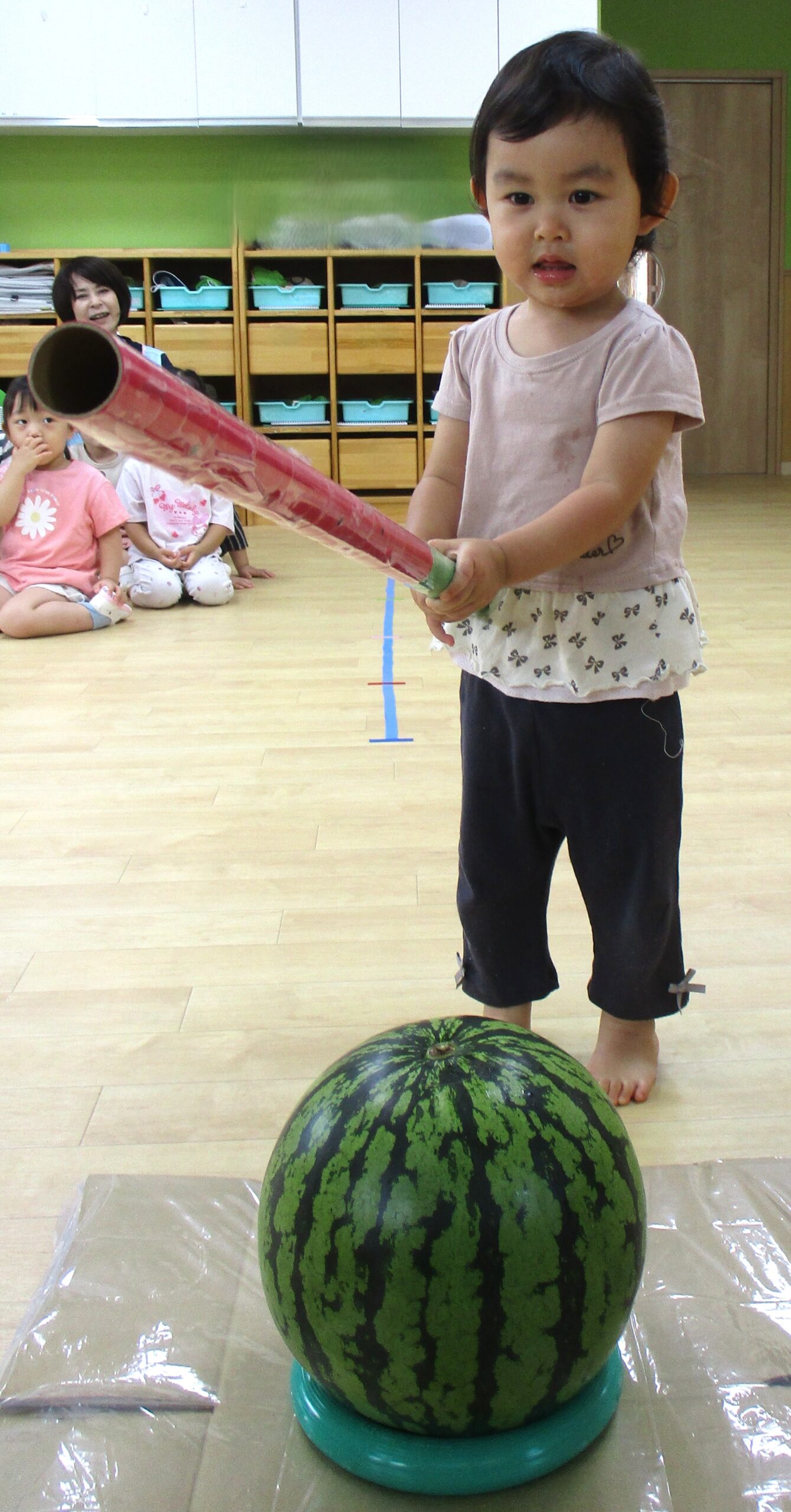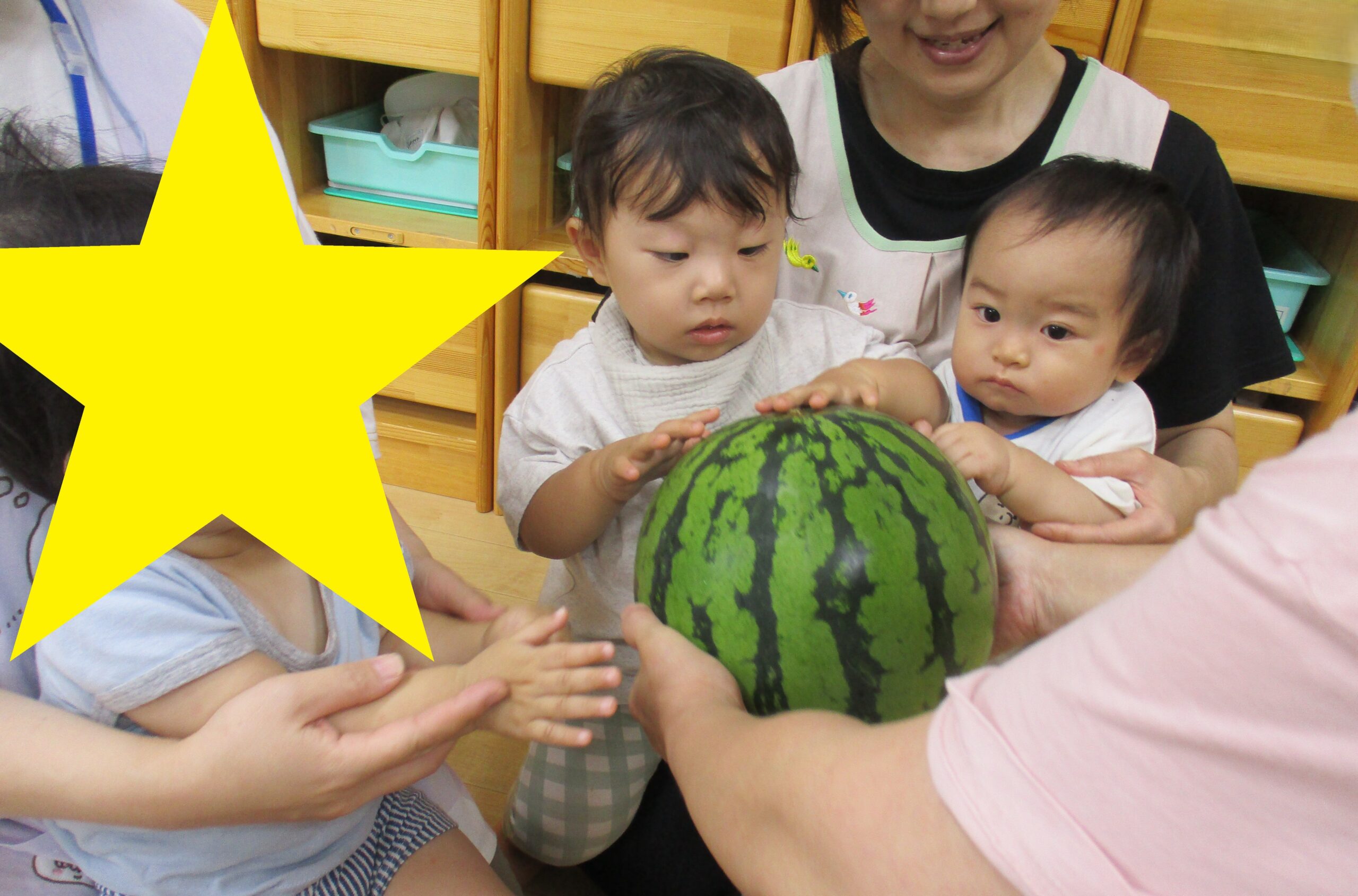 乳児クラスはお部屋でスイカ割りをしました。大きくて重いスイカにビックリしていたお友だちもいました。