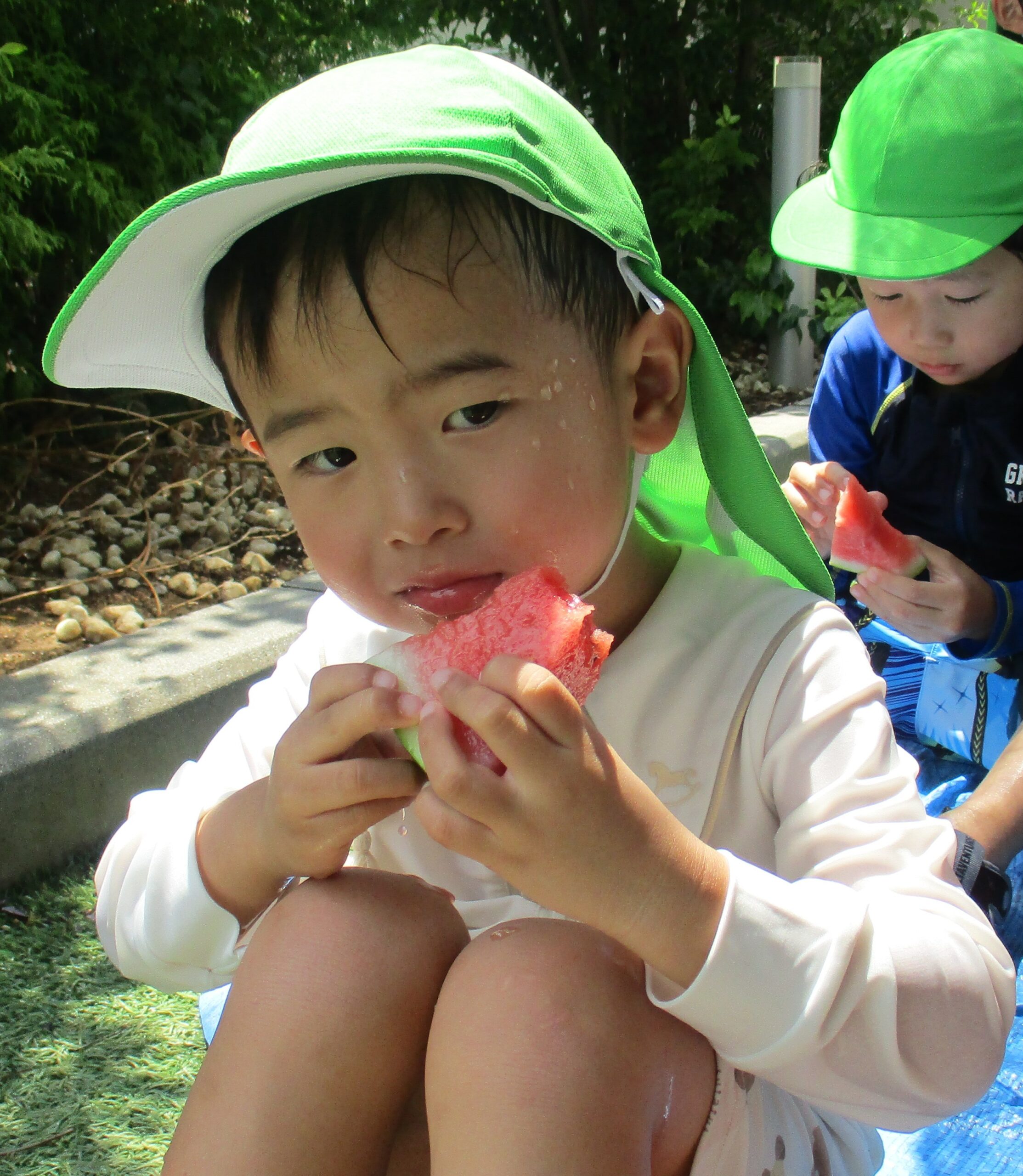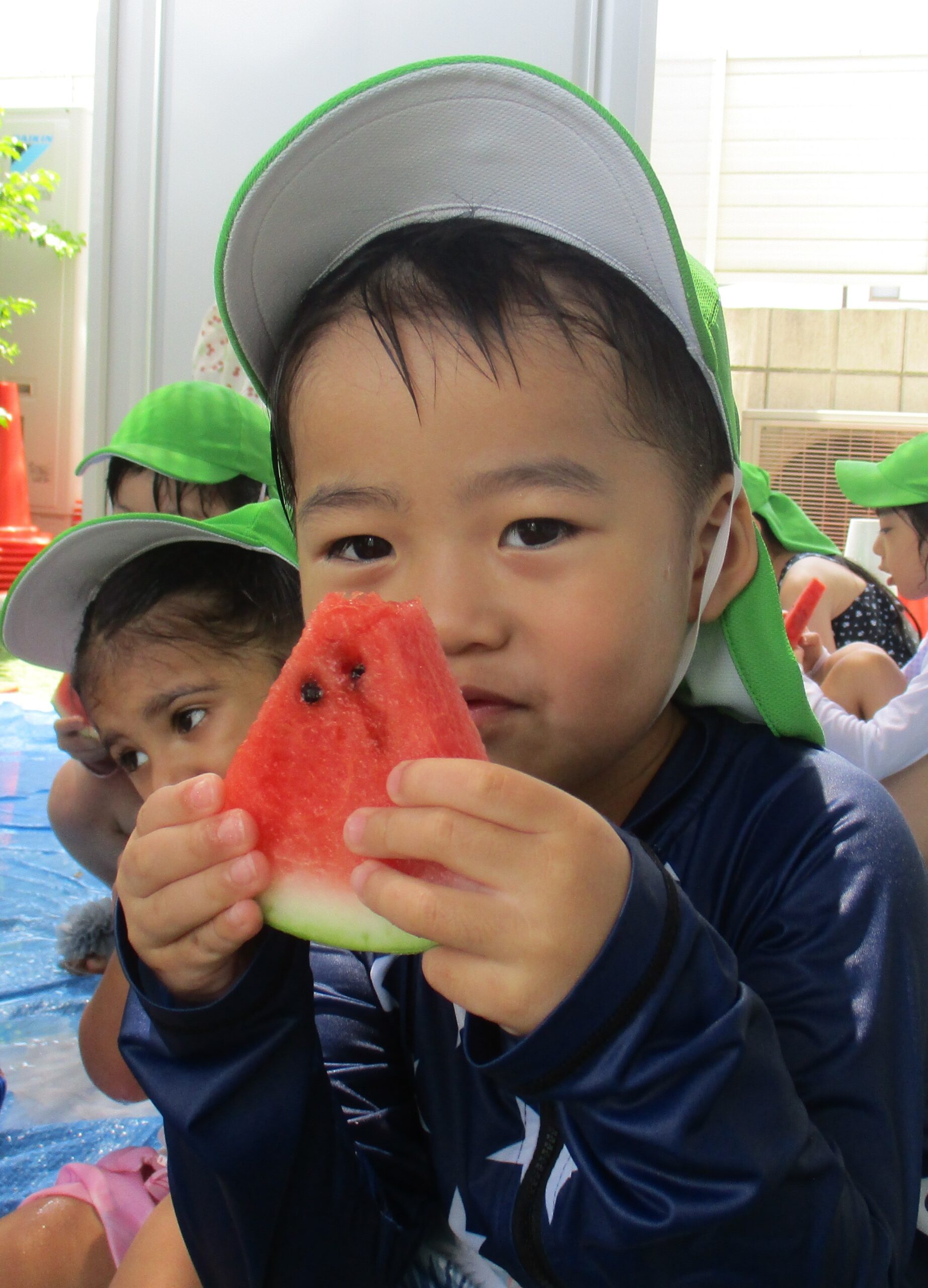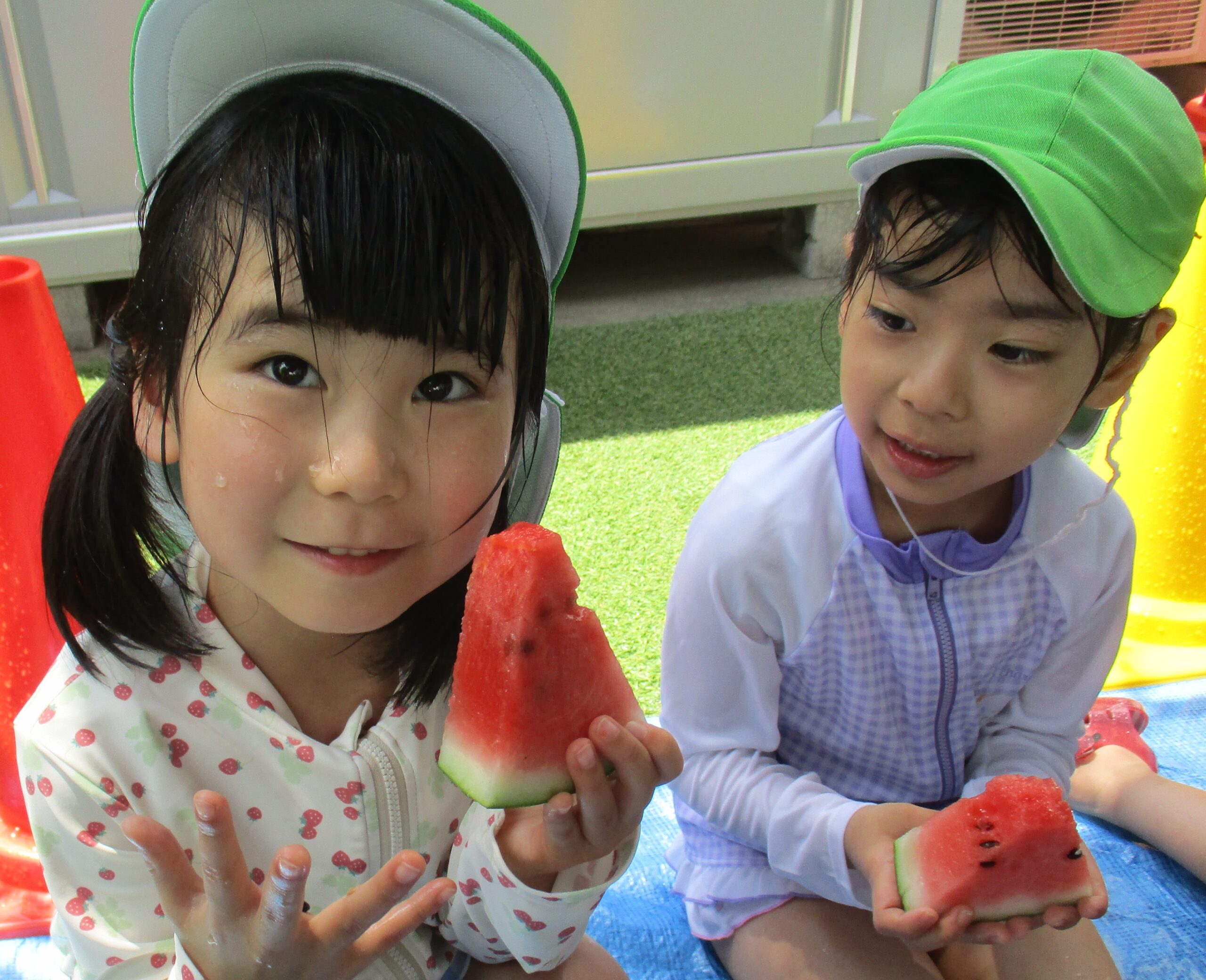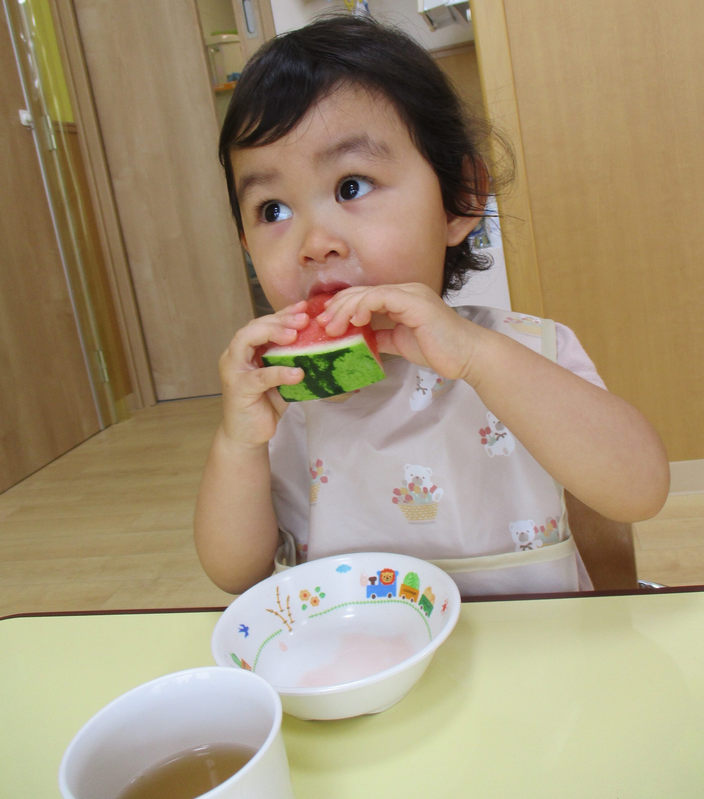 乳児クラスはお部屋でスイカ割りをしました。大きくて重いスイカにビックリしていたお友だちもいました。