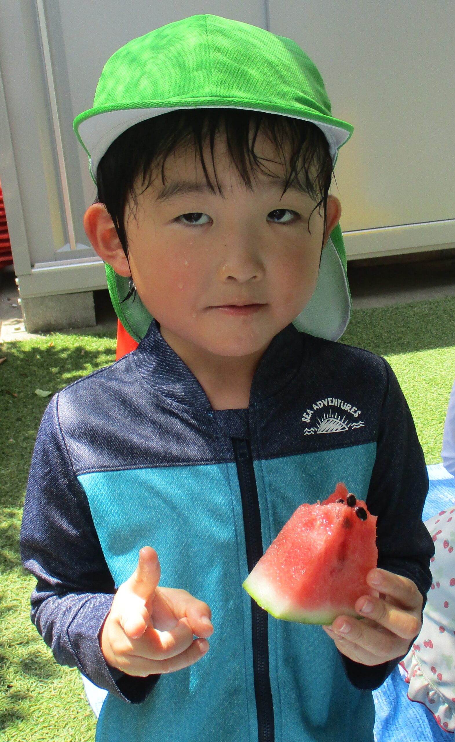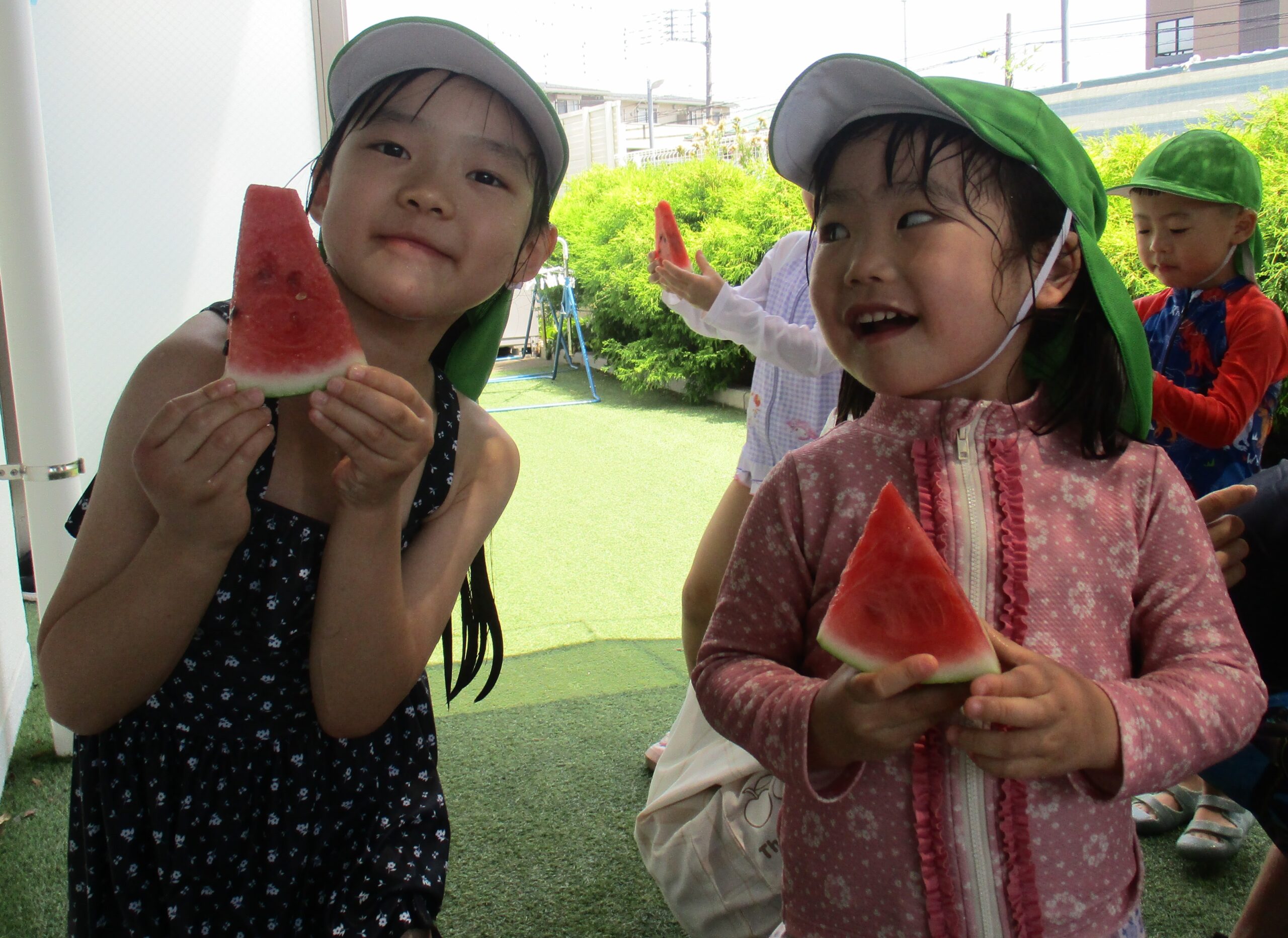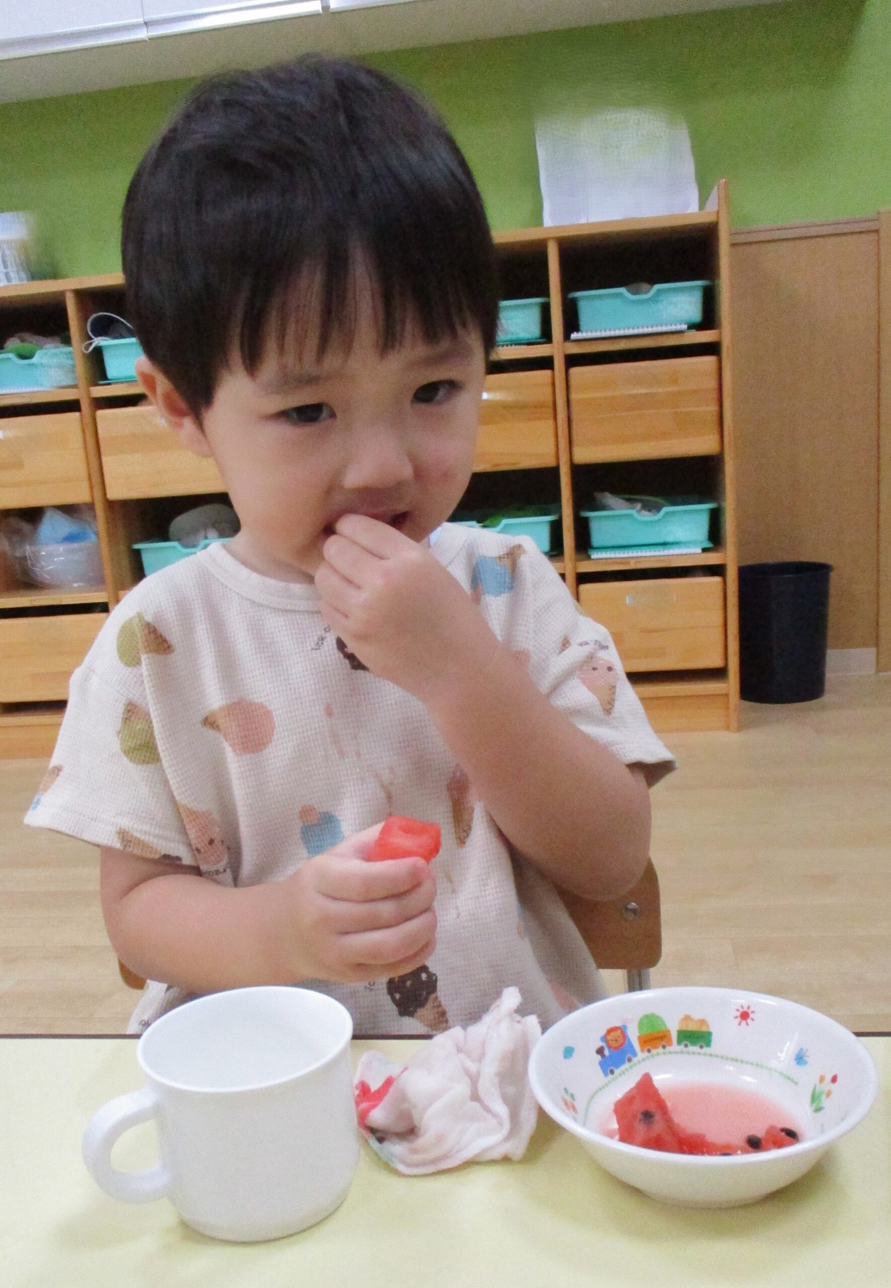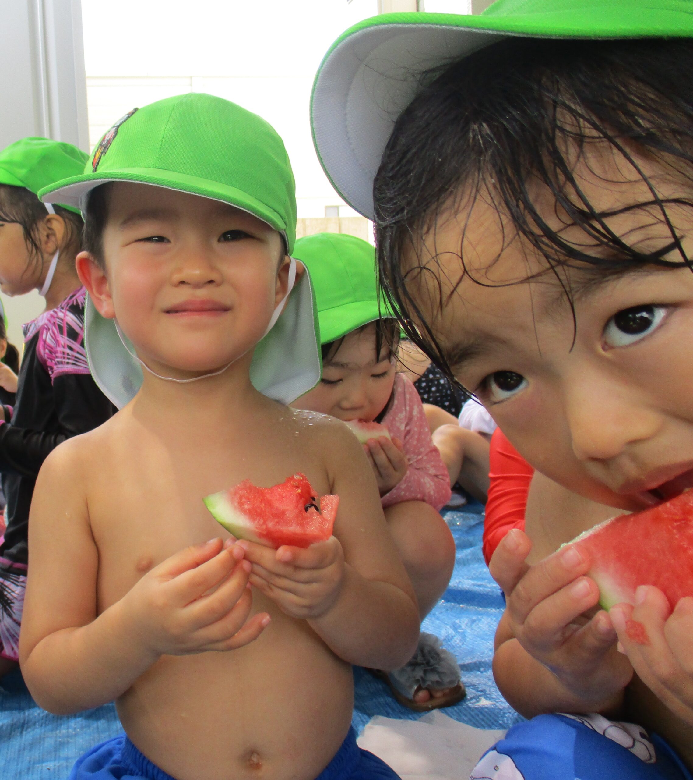乳児クラスはお部屋でスイカ割りをしました。大きくて重いスイカにビックリしていたお友だちもいました。