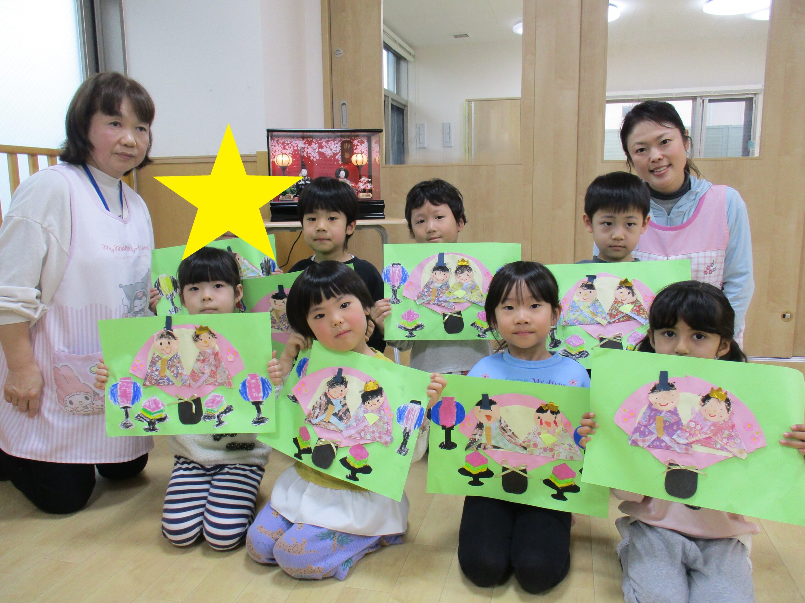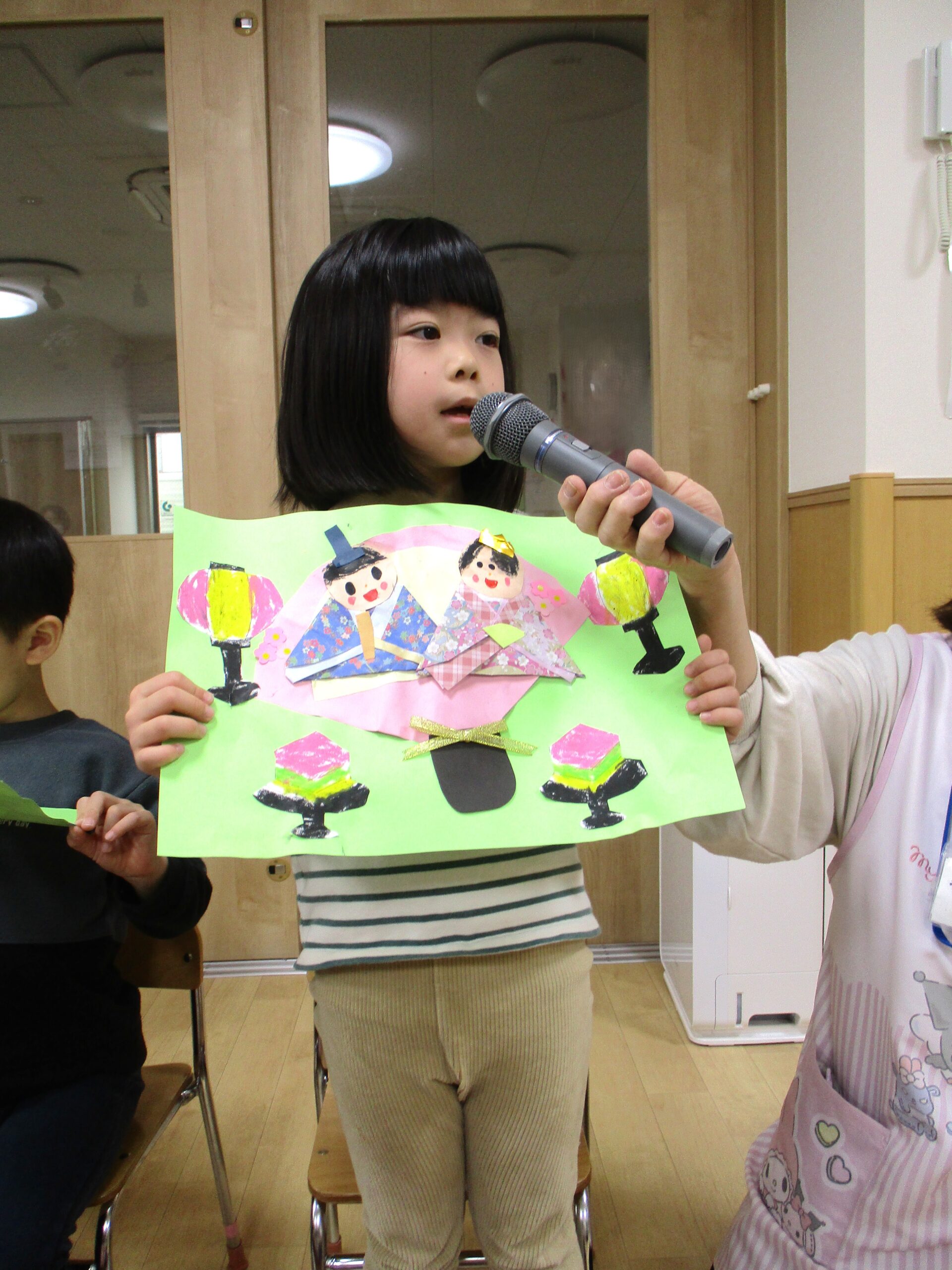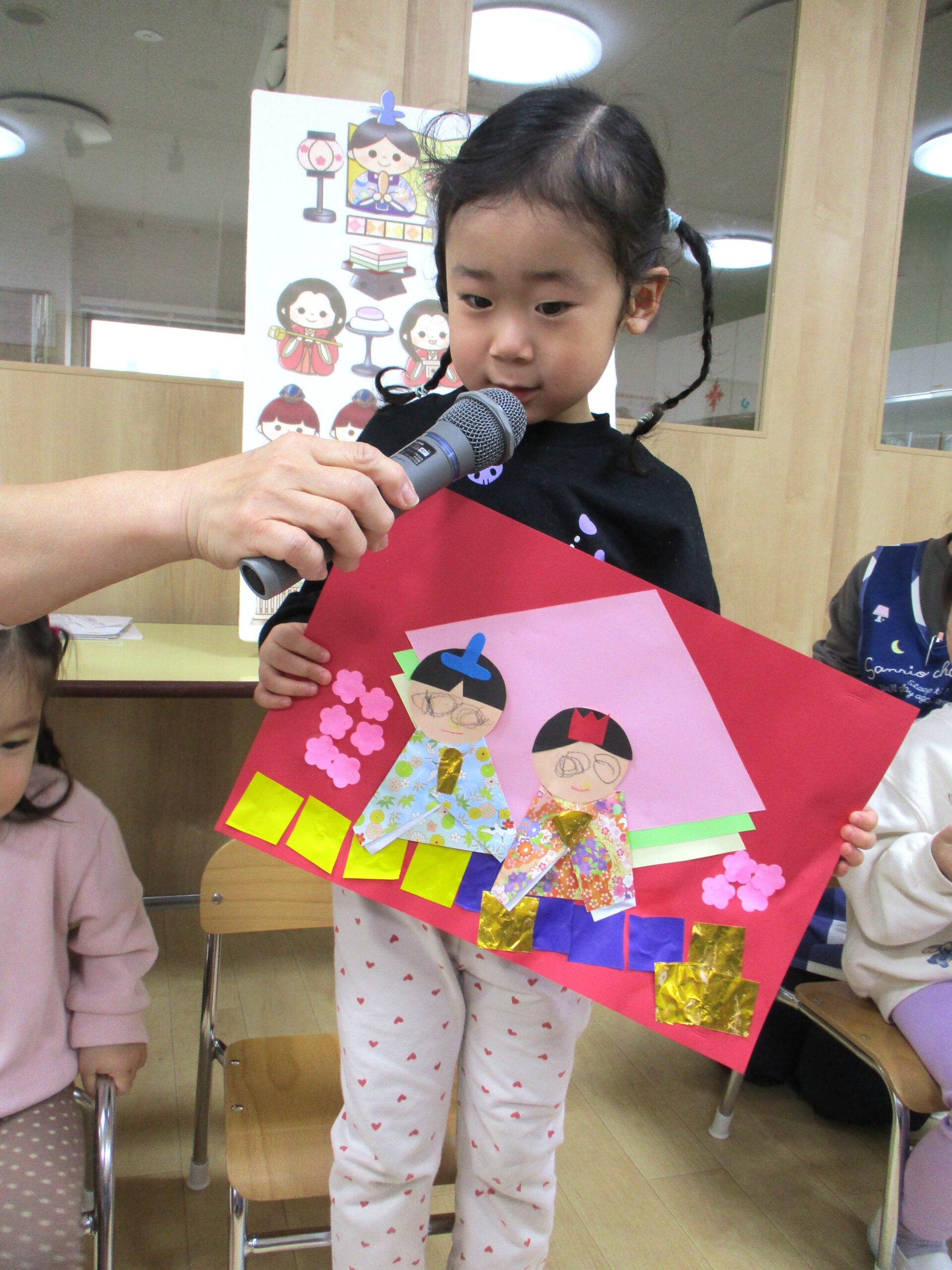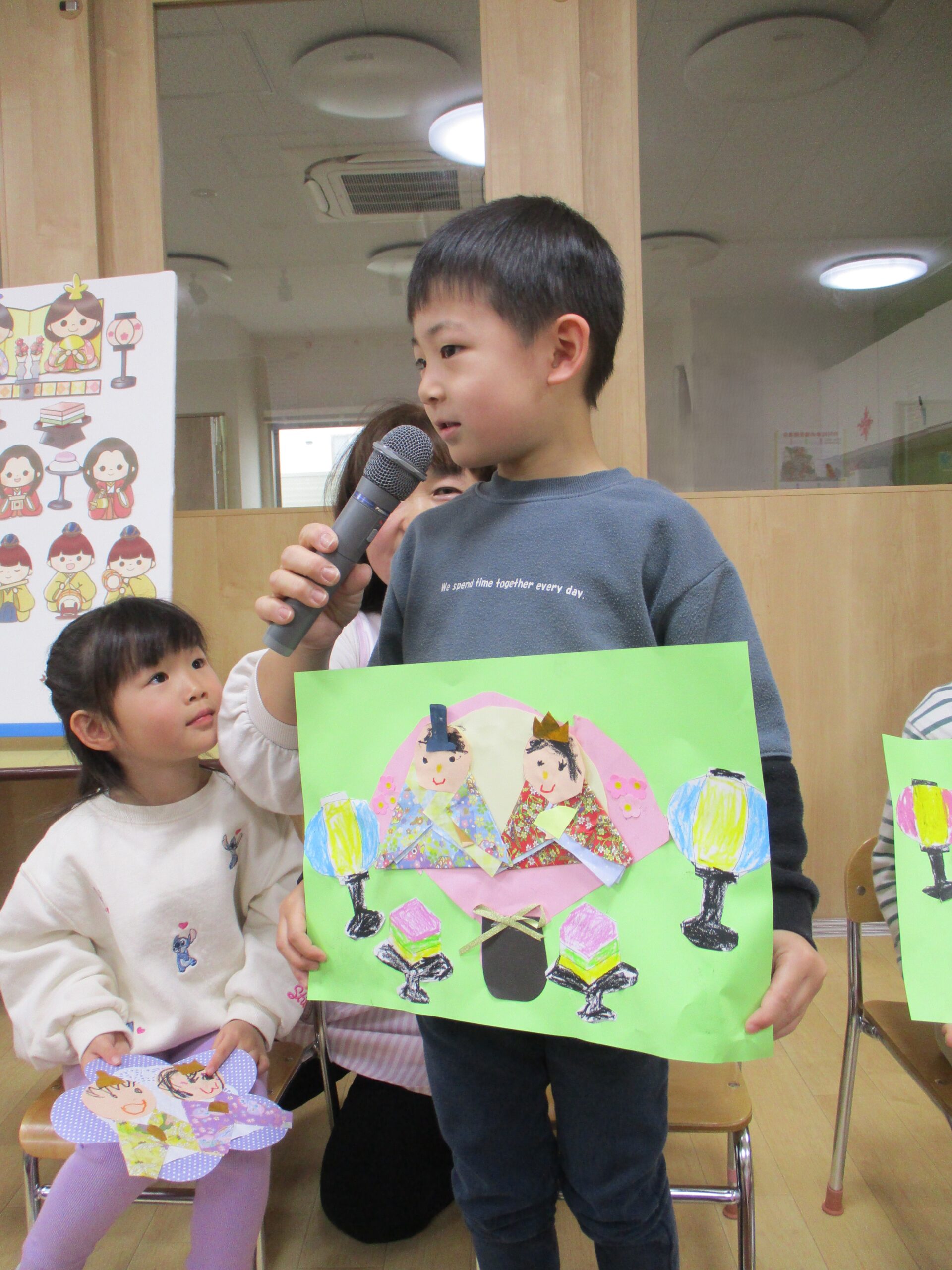 3月3日はひな祭りの会をしました。ひな祭りの由来を聞いて、各クラスの製作を発表しました。