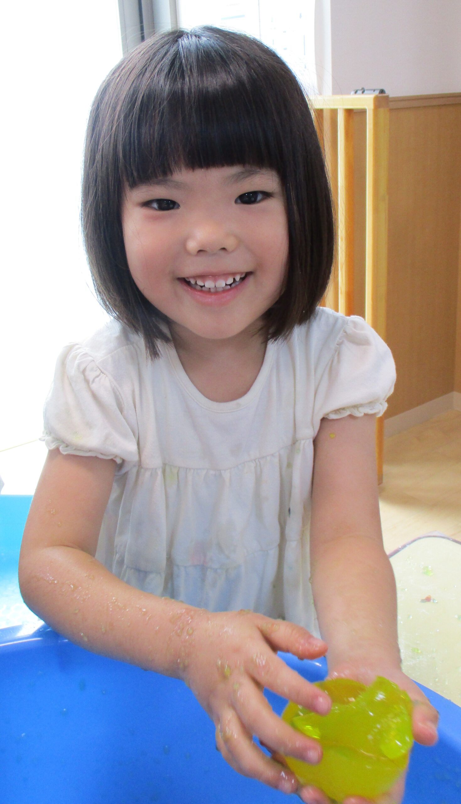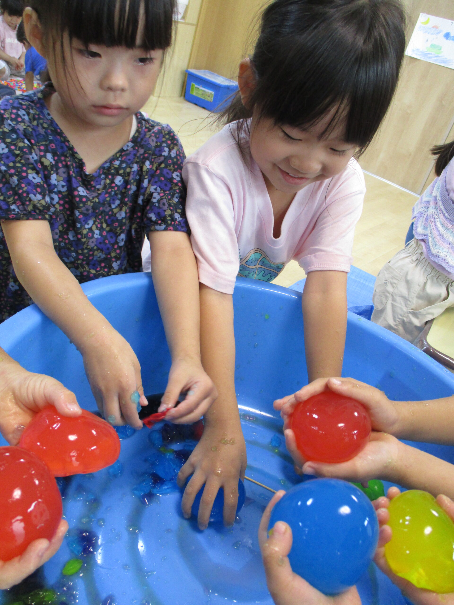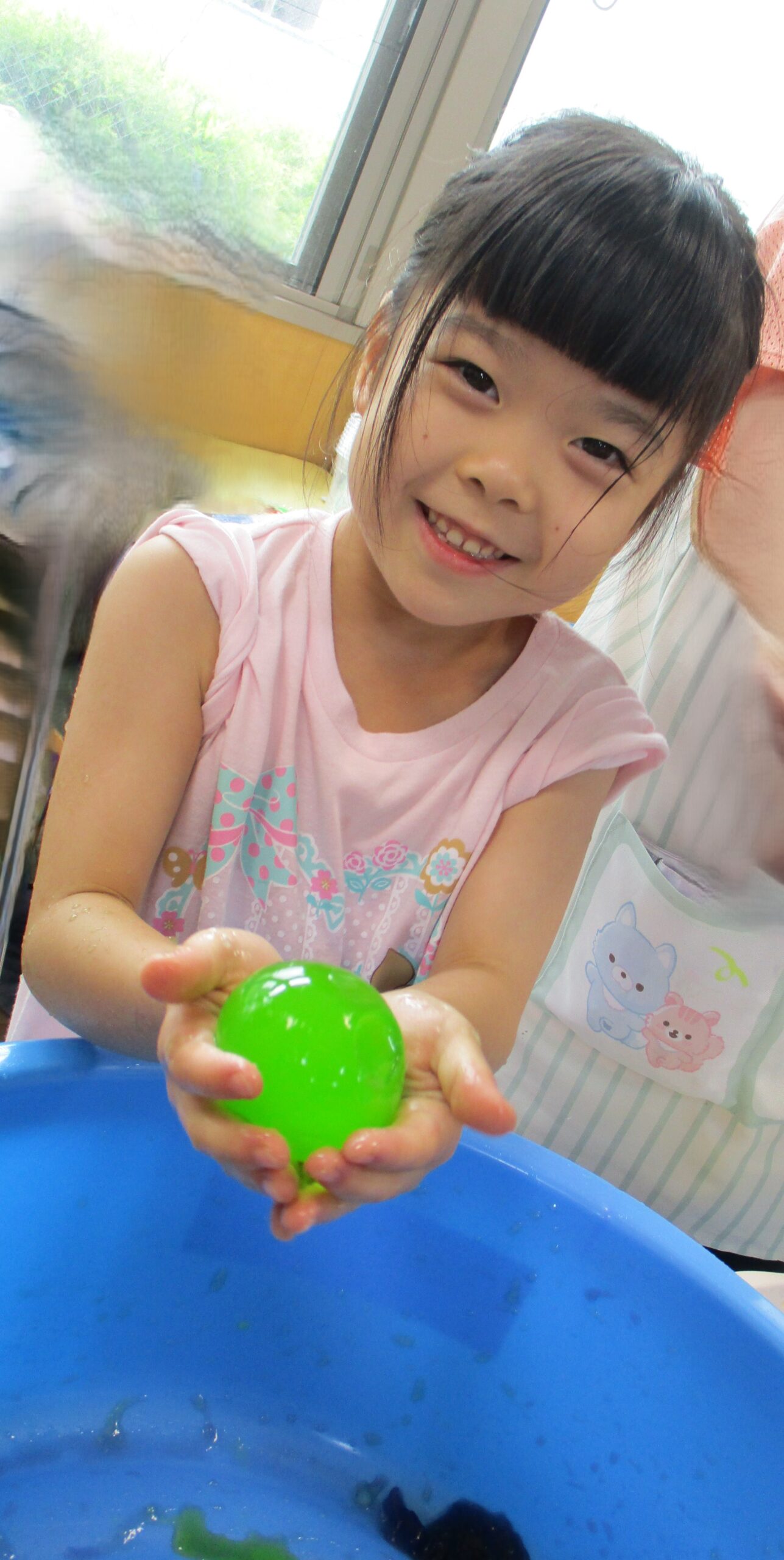 タッパーや水風船の中で固めた寒天、それぞれ違った面白さや楽しさがあったようです。そして何よりも寒天の感触や握ったときの感触を思う存分楽しんでいました。