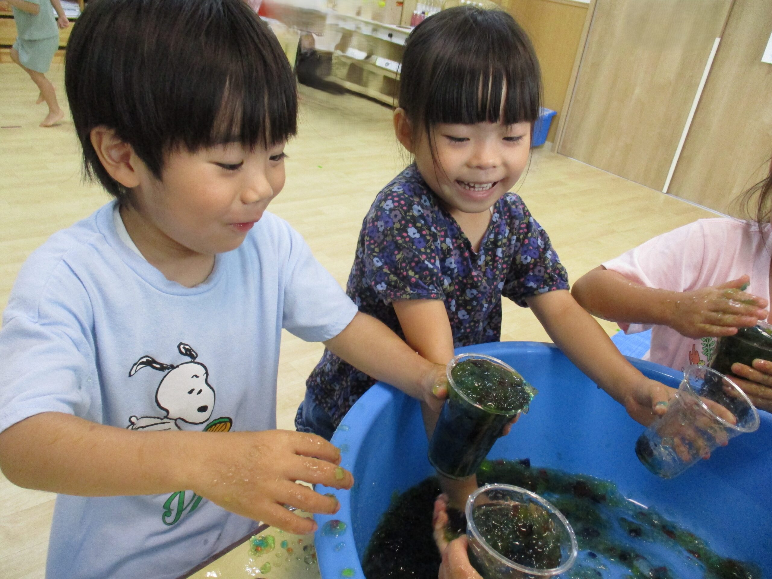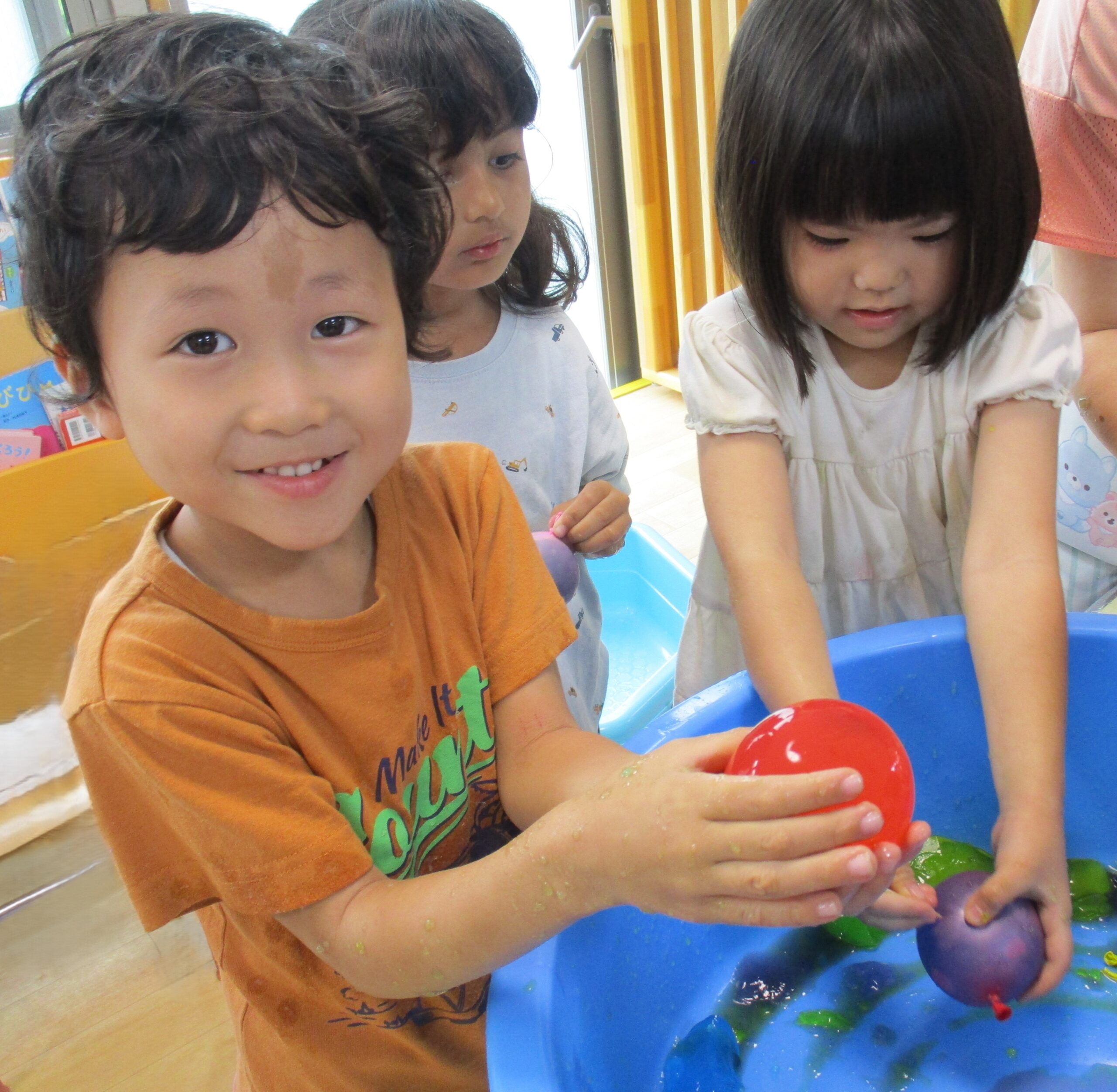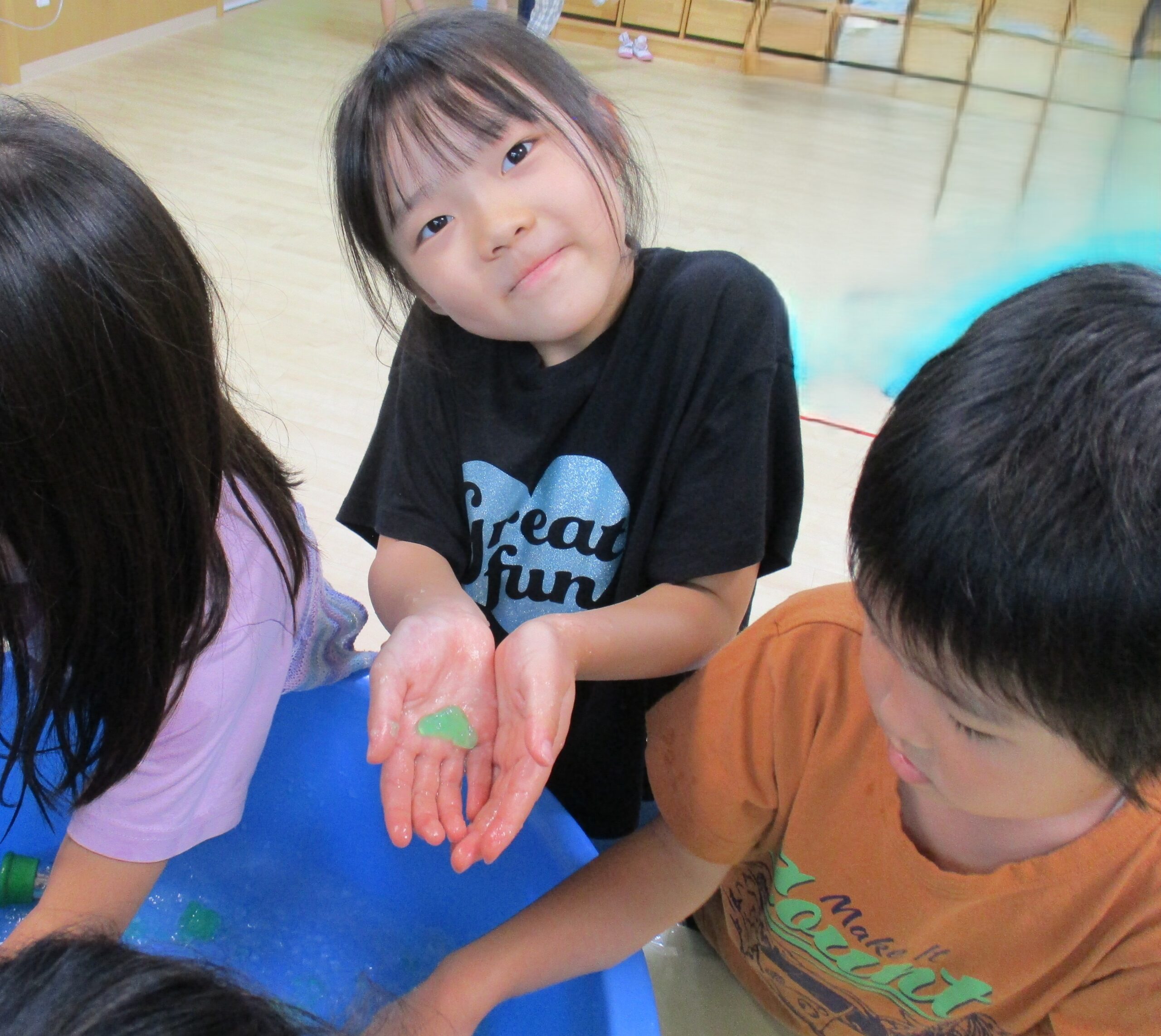タッパーや水風船の中で固めた寒天、それぞれ違った面白さや楽しさがあったようです。そして何よりも寒天の感触や握ったときの感触を思う存分楽しんでいました。