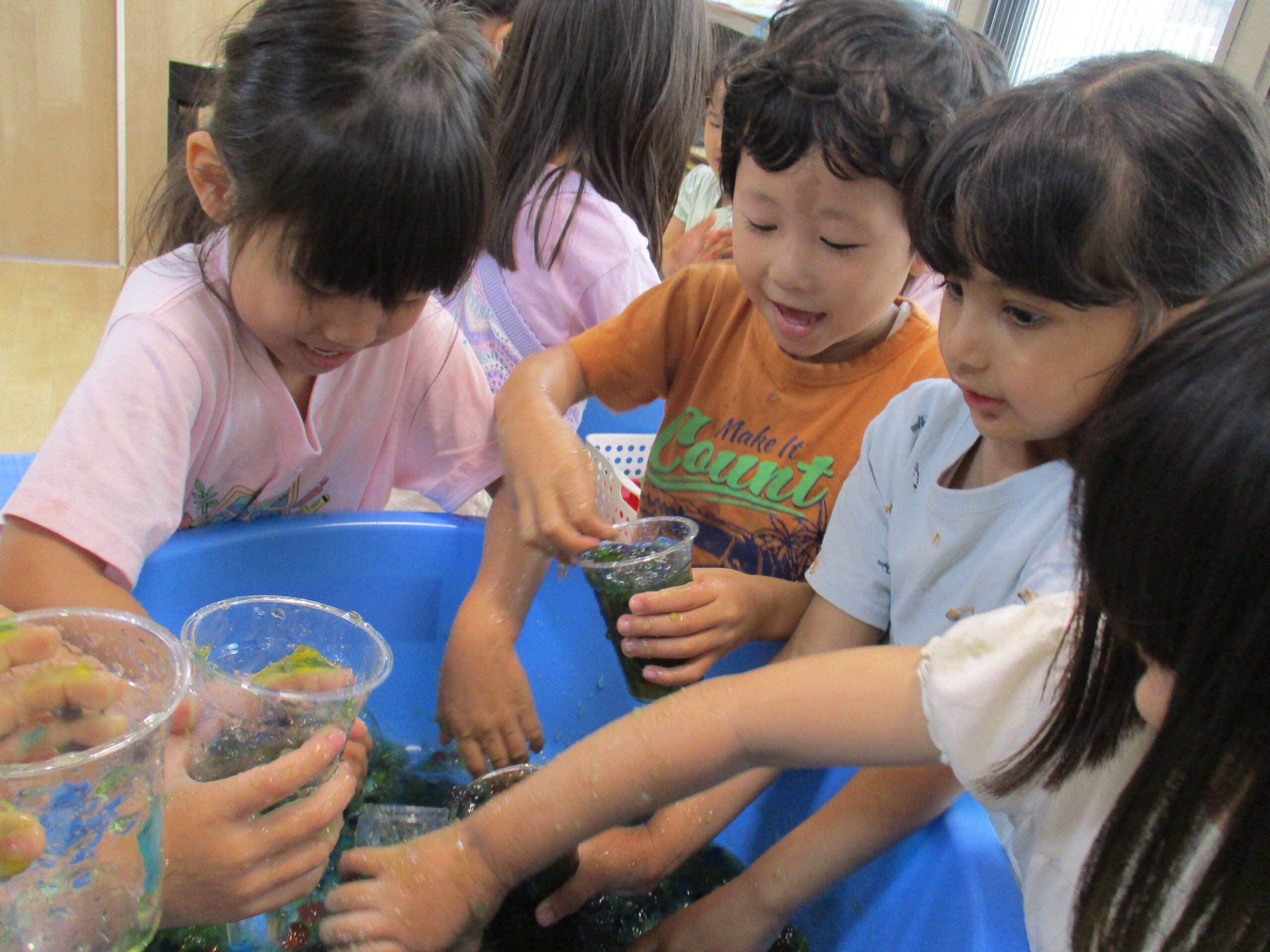 楽しみにしていた「寒天遊び」 当日は雨のため、お部屋で遊ぶことになりました。