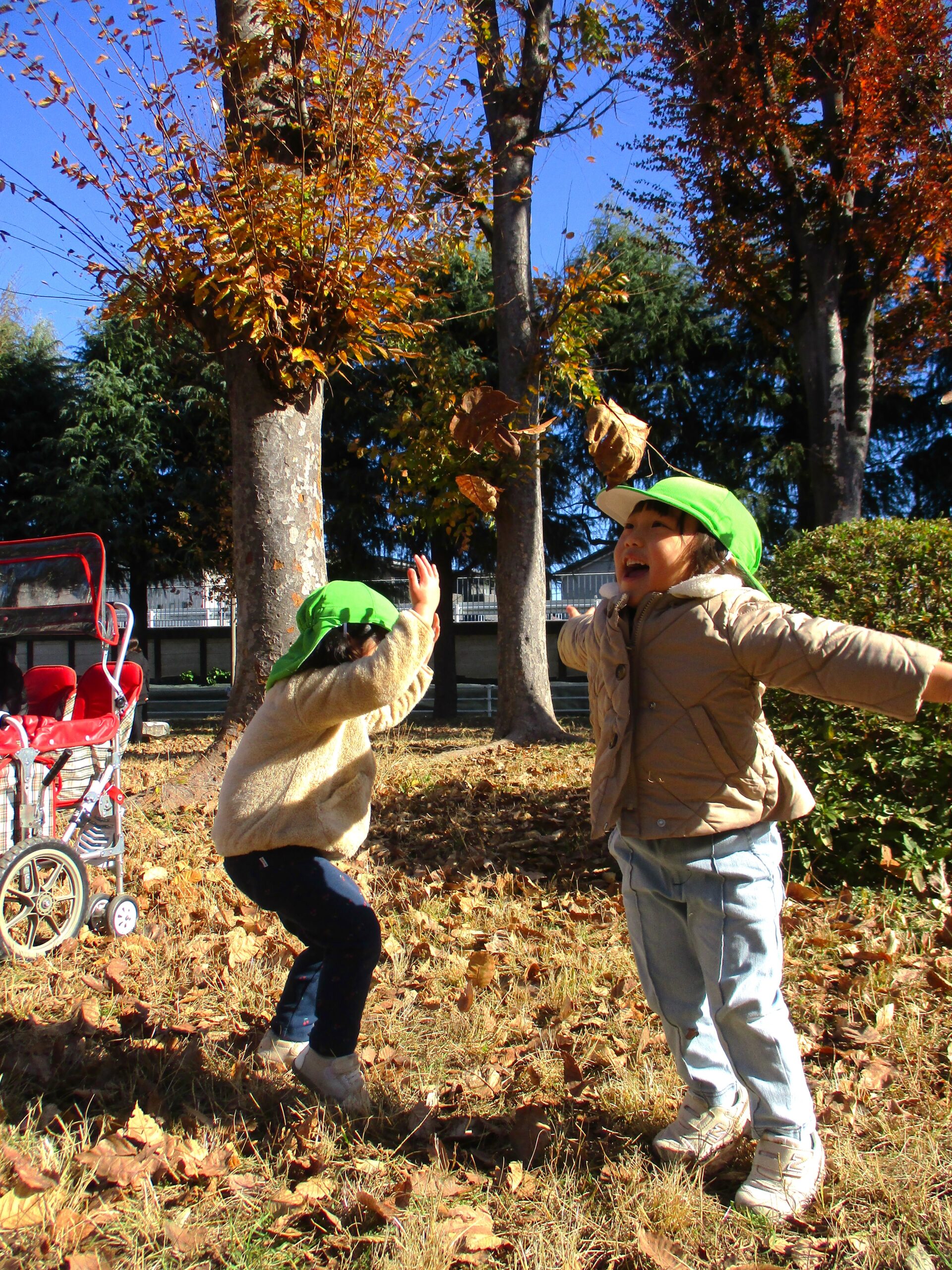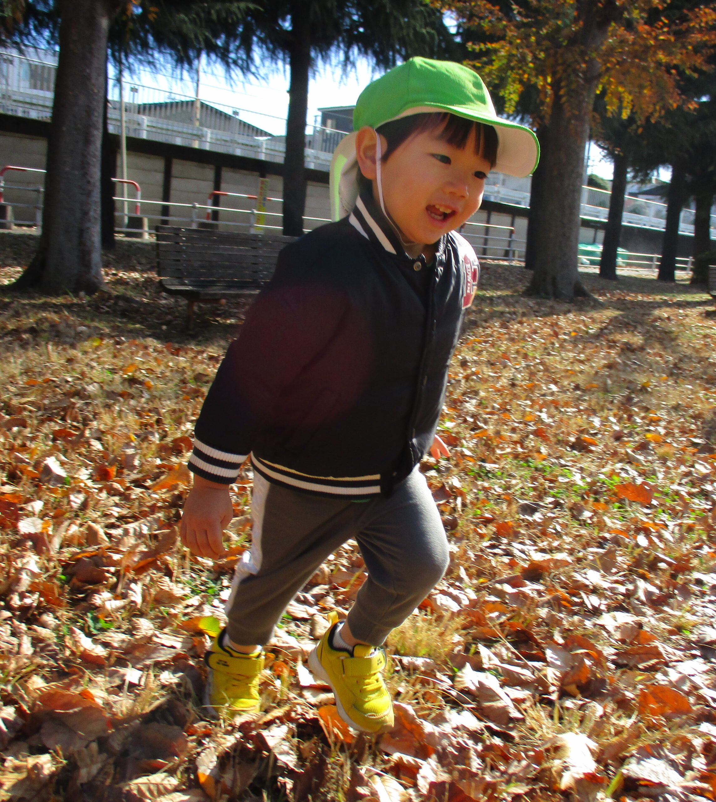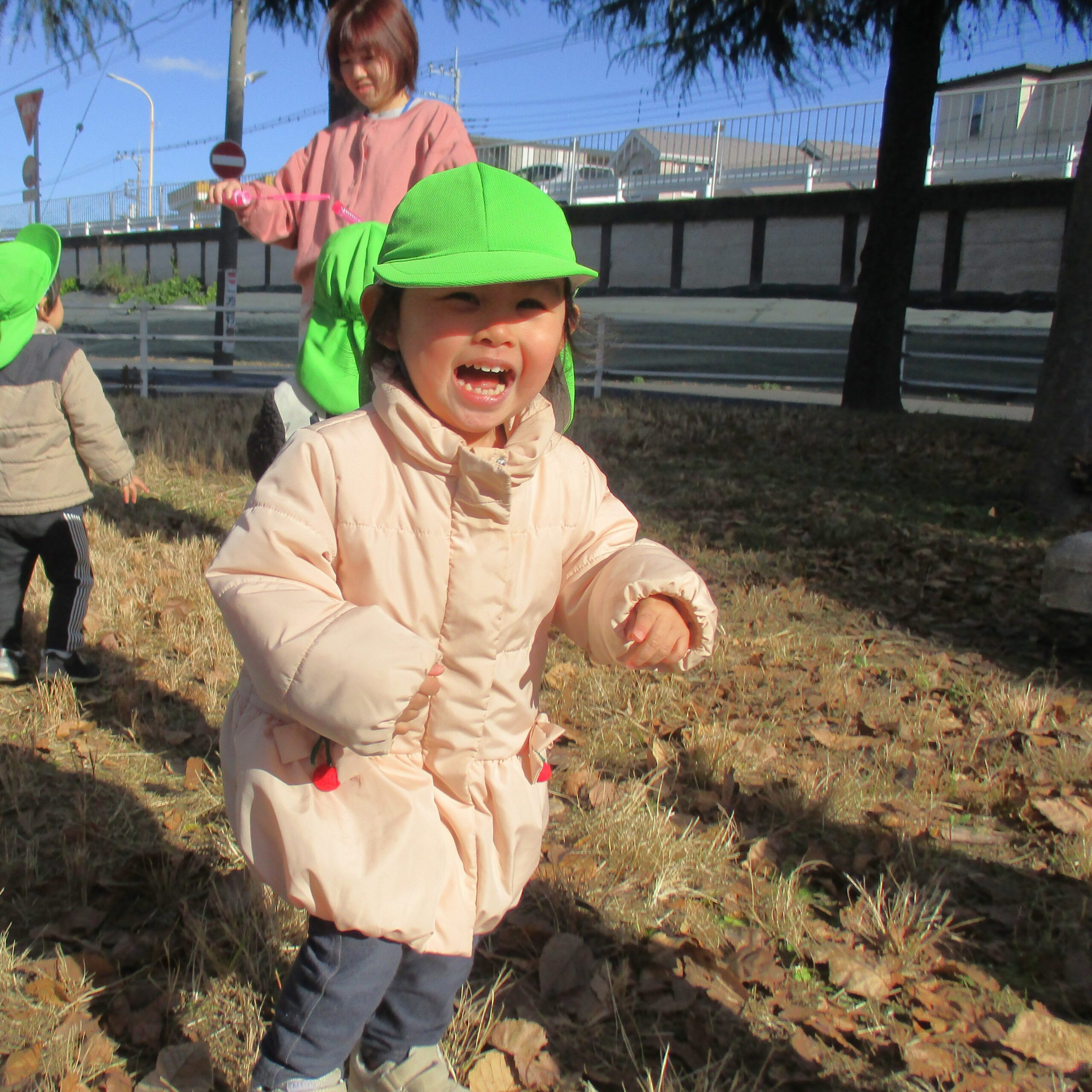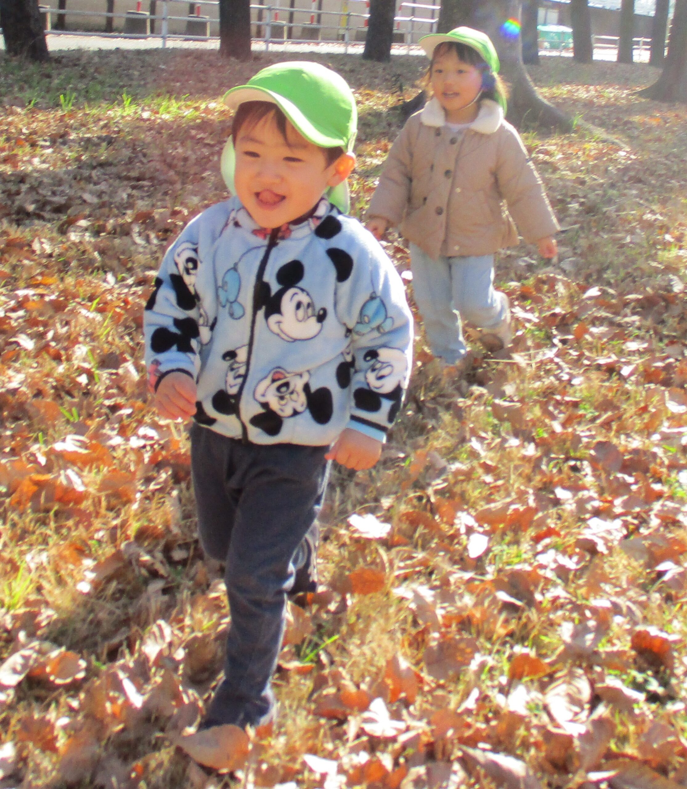 寒さに負けず、公園で元気いっぱい遊んでいます。お友だちと追いかけっこをしたり、落ち葉遊びをしたり、みんなと仲良く遊び、笑顔が溢れるいますね。