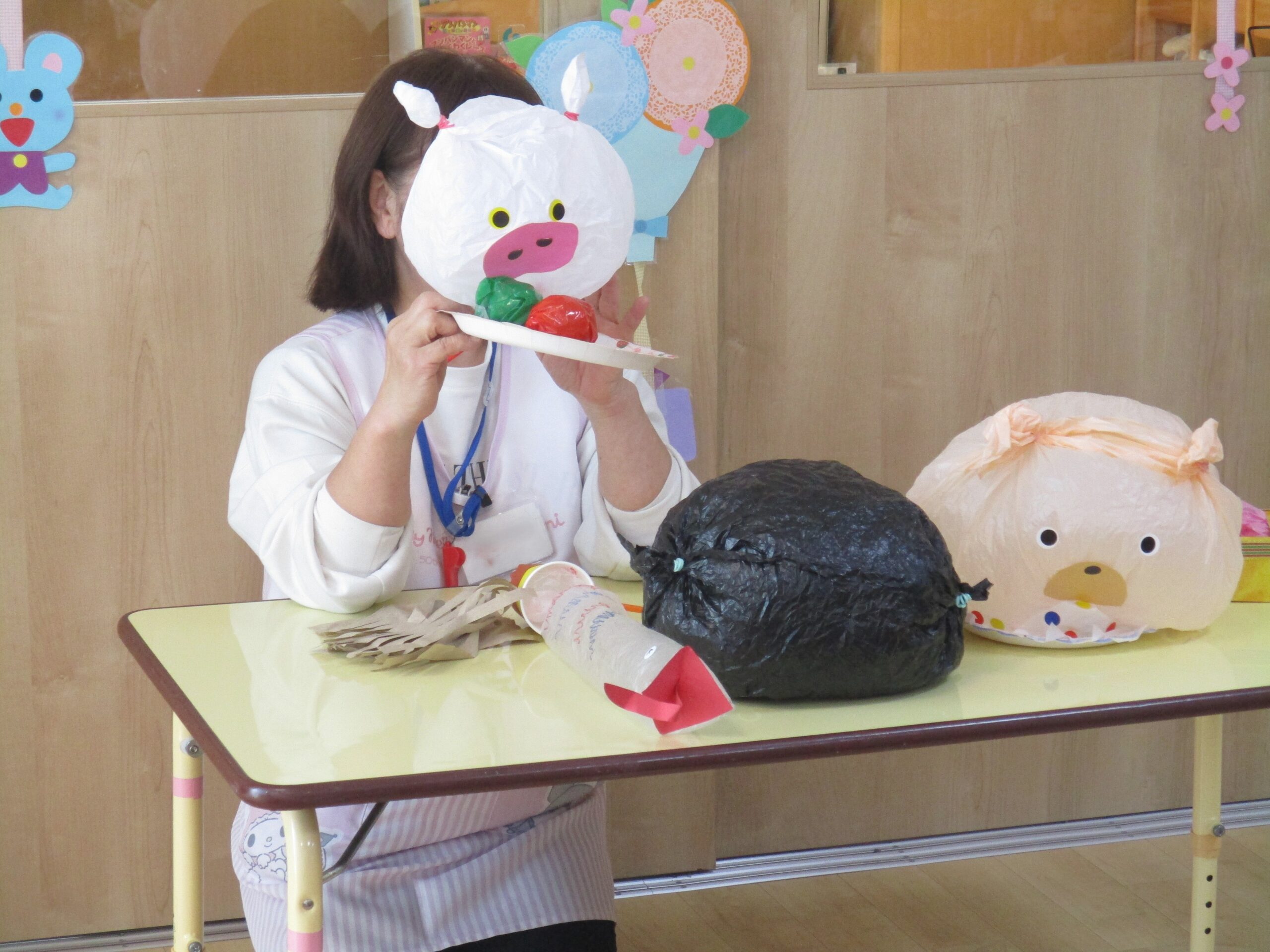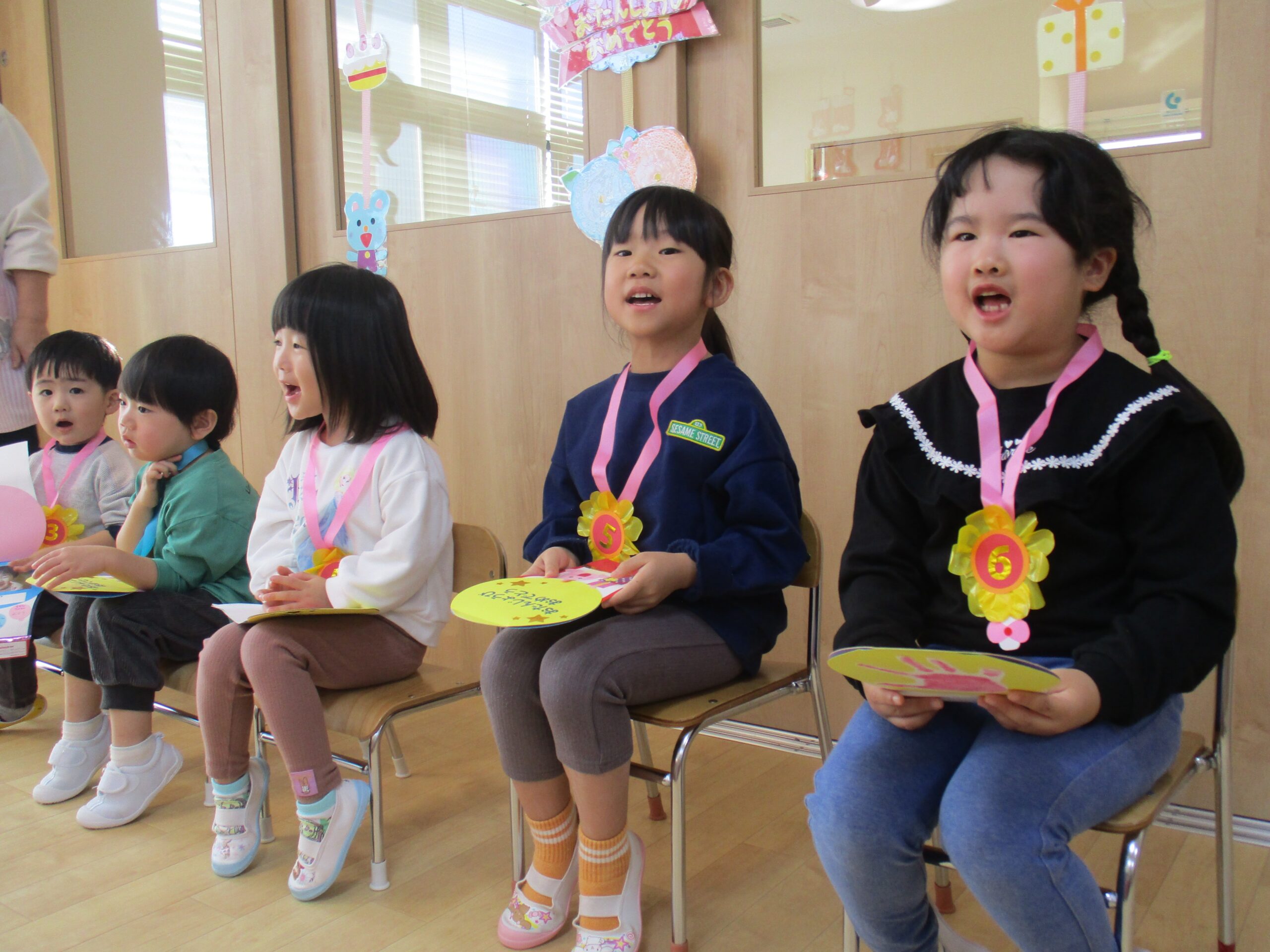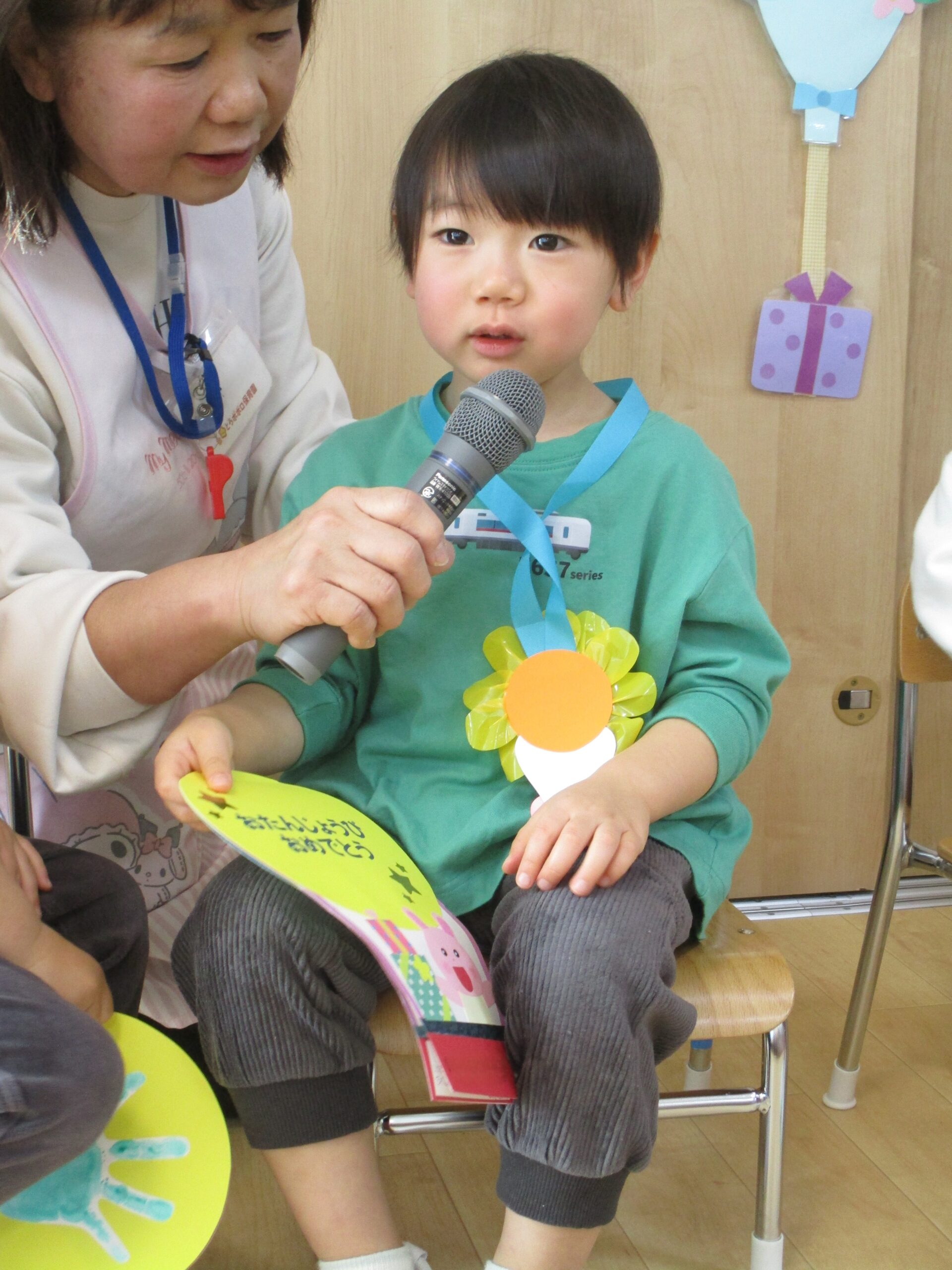 12月は5名のお友だちが誕生日を迎えました。好きな食べ物、遊び、将来の夢をインタビューされ、立派に答えていました。先生からのプレゼントは「ぷっくりシアター」でした。