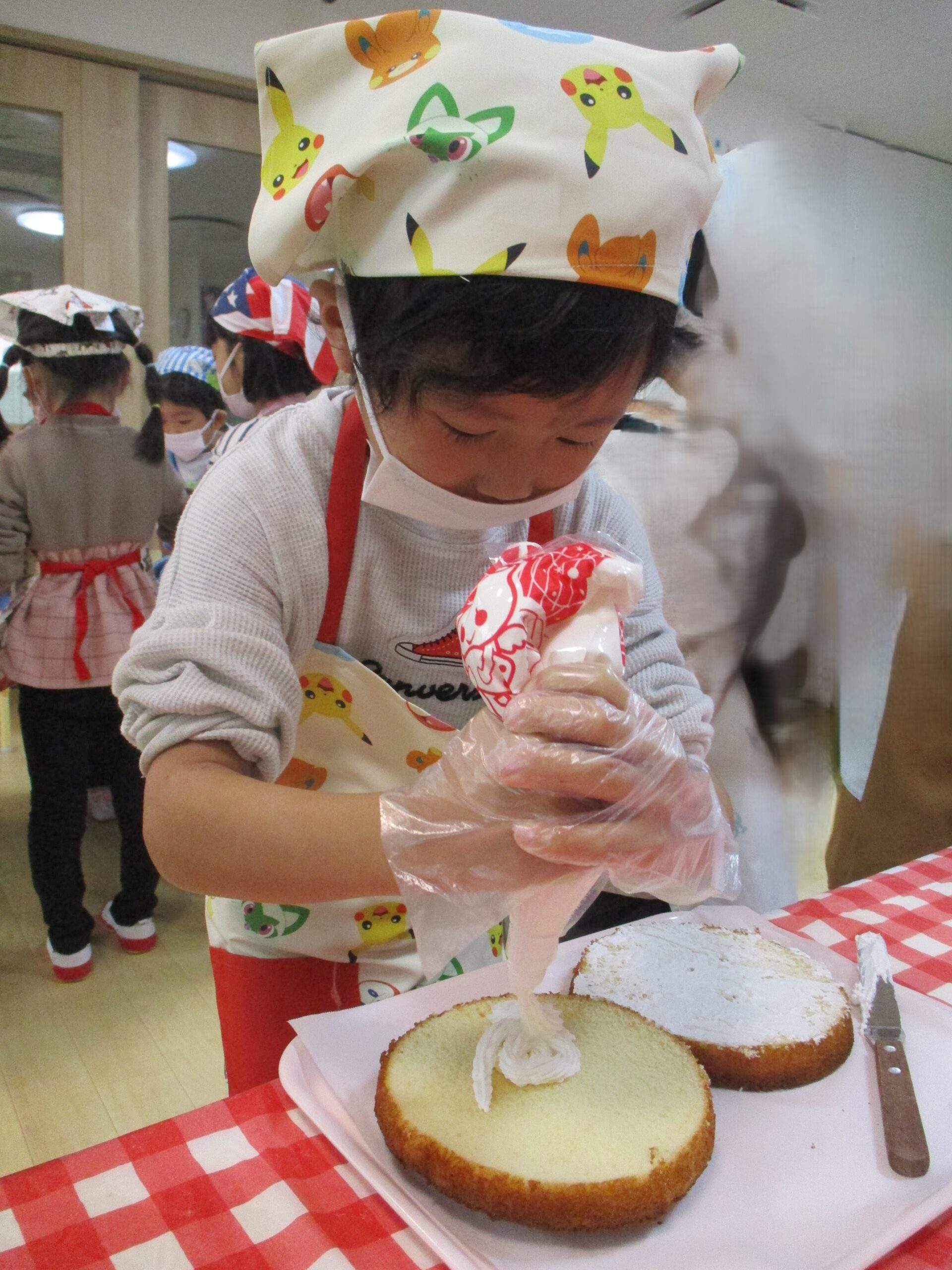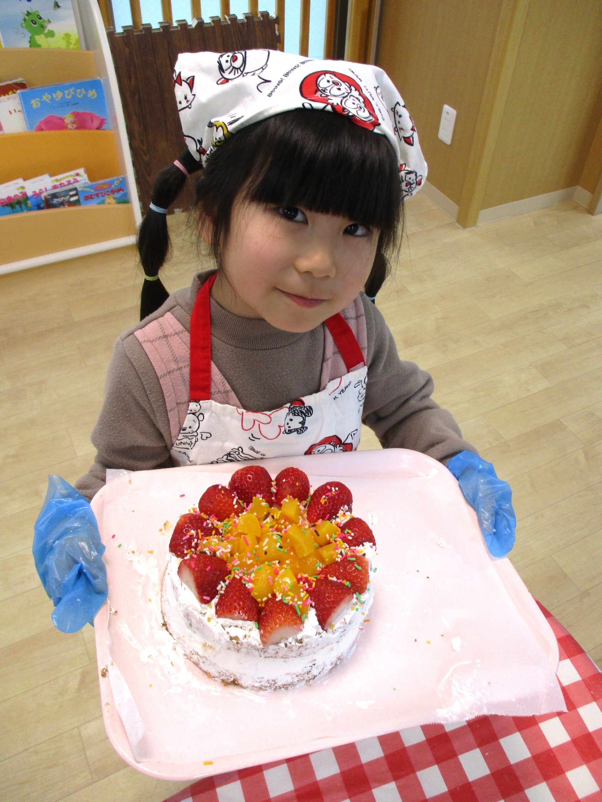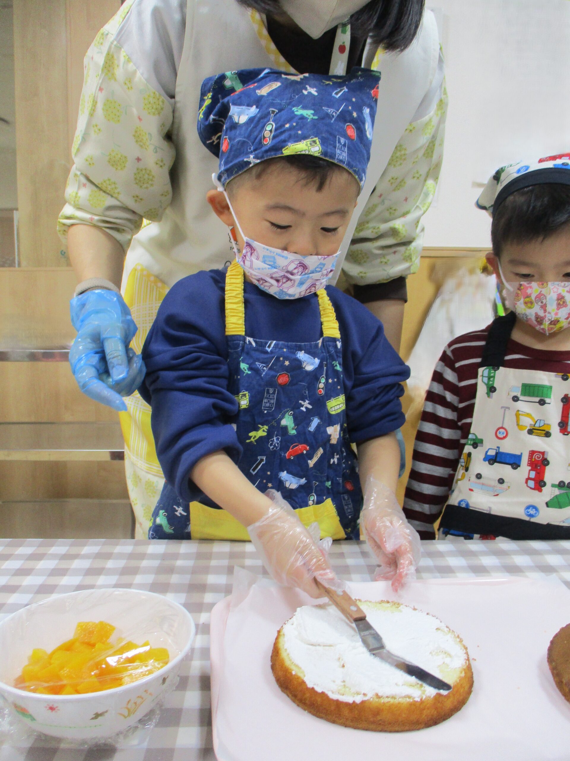 スポンジにクリームを塗ったり、果物やチョコスプレーでデコレーションをしました。お友だちとどう飾ろうか話し合ったりしながら仲良く作っていました。